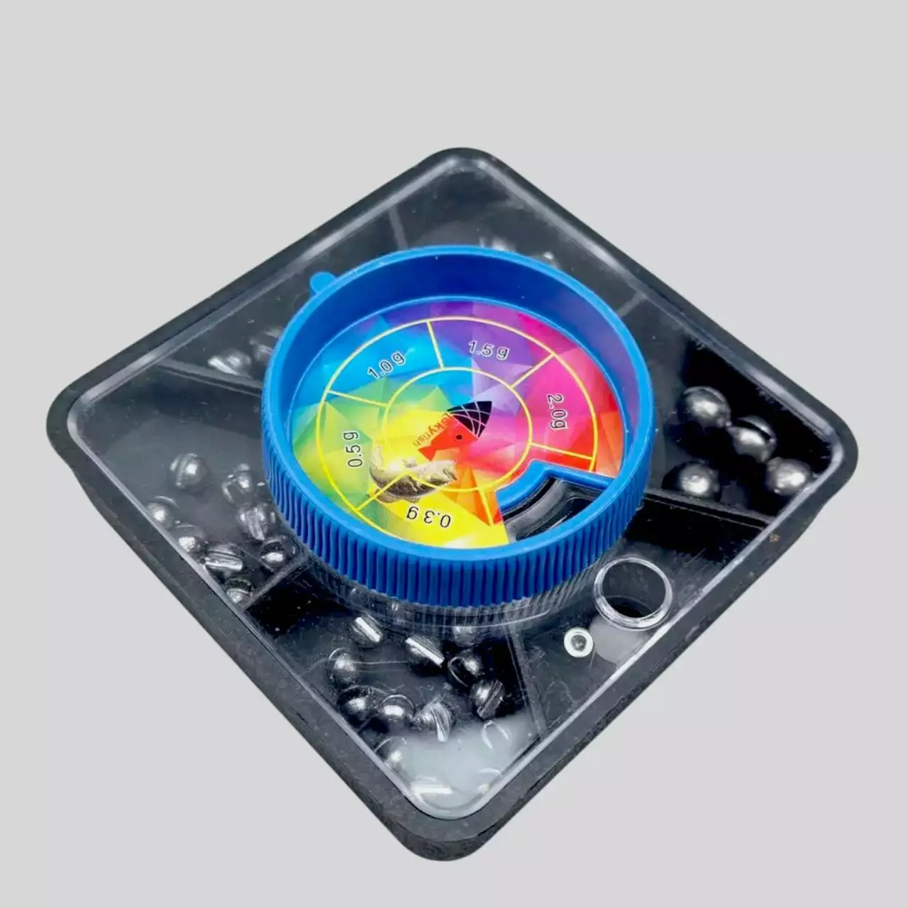 Набір рибальських свинцевих дробинок у практичному квадратному контейнері з центральним круговим дозатором. Різні ваги дробинок дозволяють точно огрузити поплавкову снасть під будь-які умови ловлі.