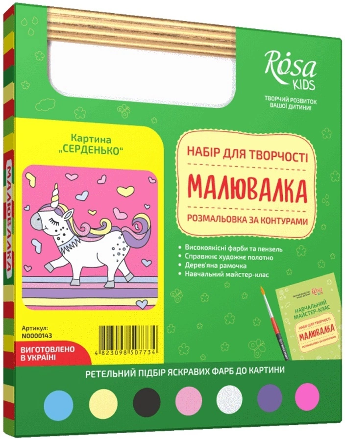 Розфарбування по контурах «Малювалка» створена спеціально для юних художників! Вона легко поєднує заняття творчістю з позитивними емоціями і допоможе дитині зануритися в дивовижний і захоплюючий світ мистецтва! Переваги акрилових фарб: не мають запаху; не жовтіють і не тріскаються; швидко сохнуть на полотні; добре змішуються між собою. Набори для творчості МАЛЮВАЛКА - це 1. Широкий вибір мотивів 2. Яскраві кольори. 3. Високоякісні матеріали 4. Майстер-клас з докладним описом змішування кольорів. 5. Прекрасний подарунок. 6. Старт дитини в майбутнє мистецтва! У наборі: Акрилові фарби 7х5 см3 з ретельним підбором яскравих кольорів до картини; Високоякісна кисть; Художнє полотно на картоні з контуром малюнка, 20х30 см; Дерев'яна рамочка; Навчальний майстер-клас.