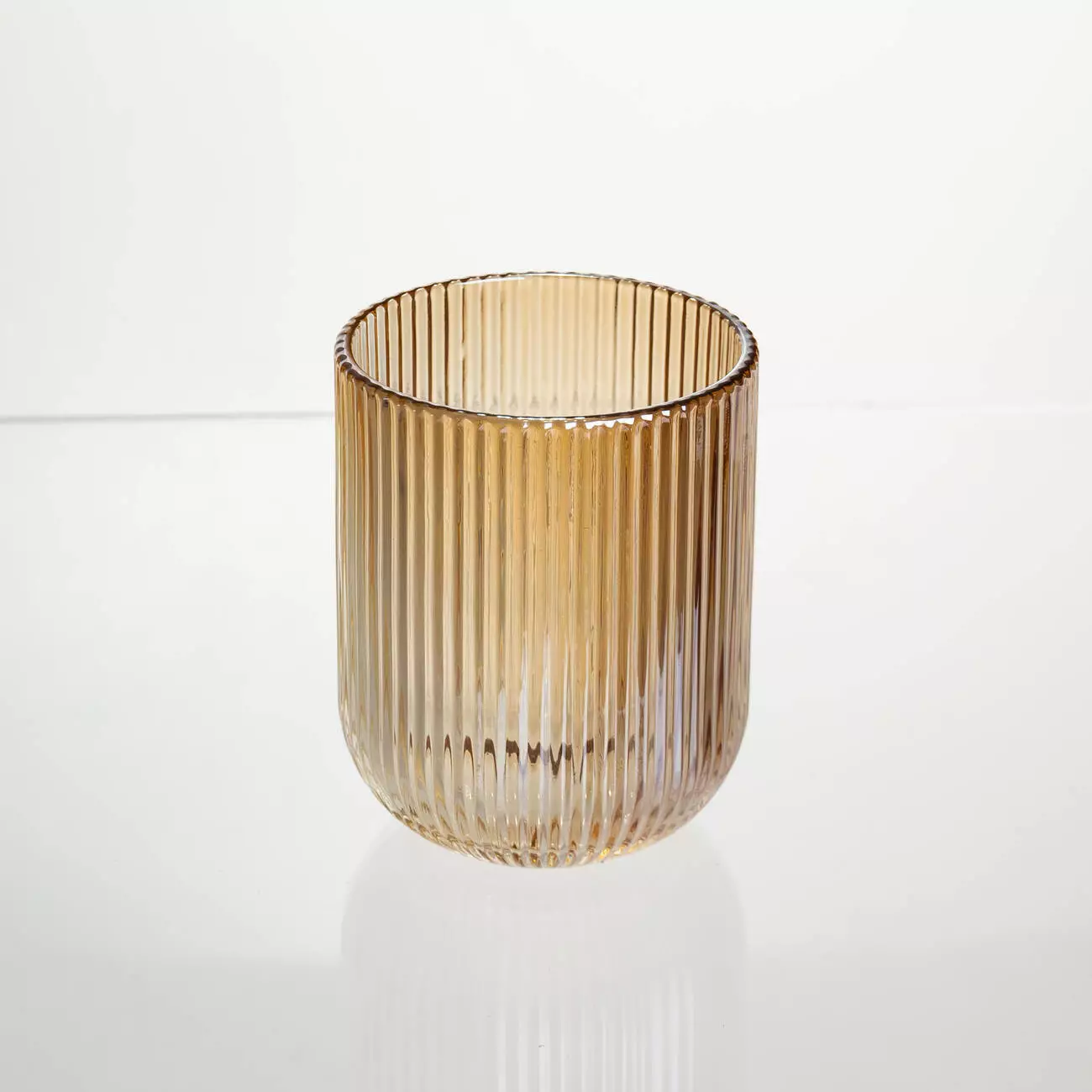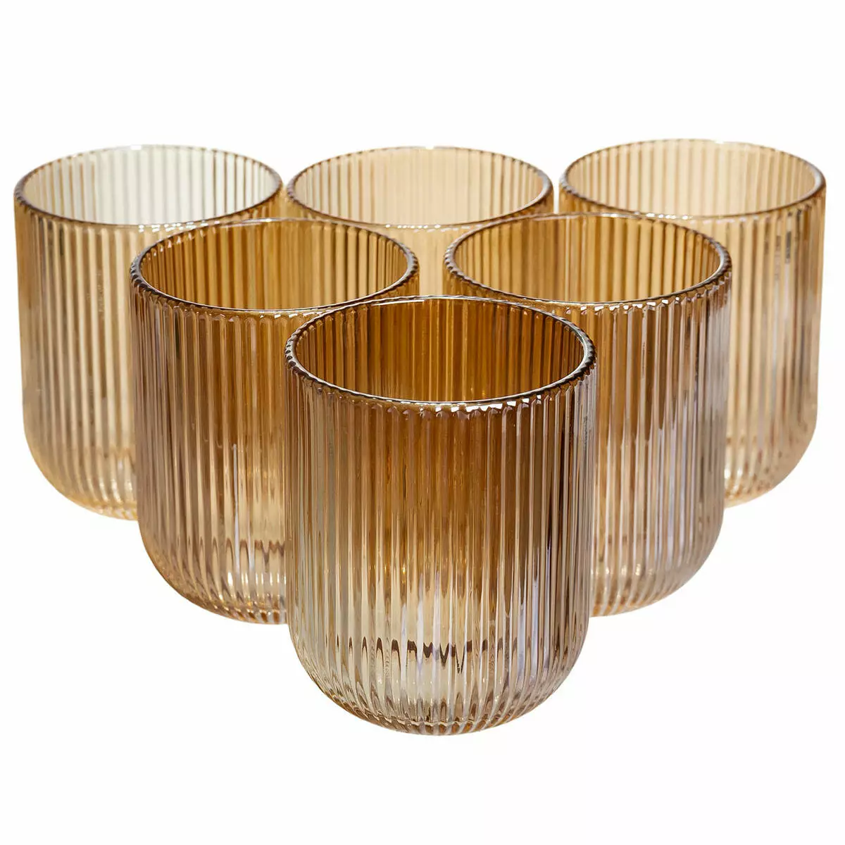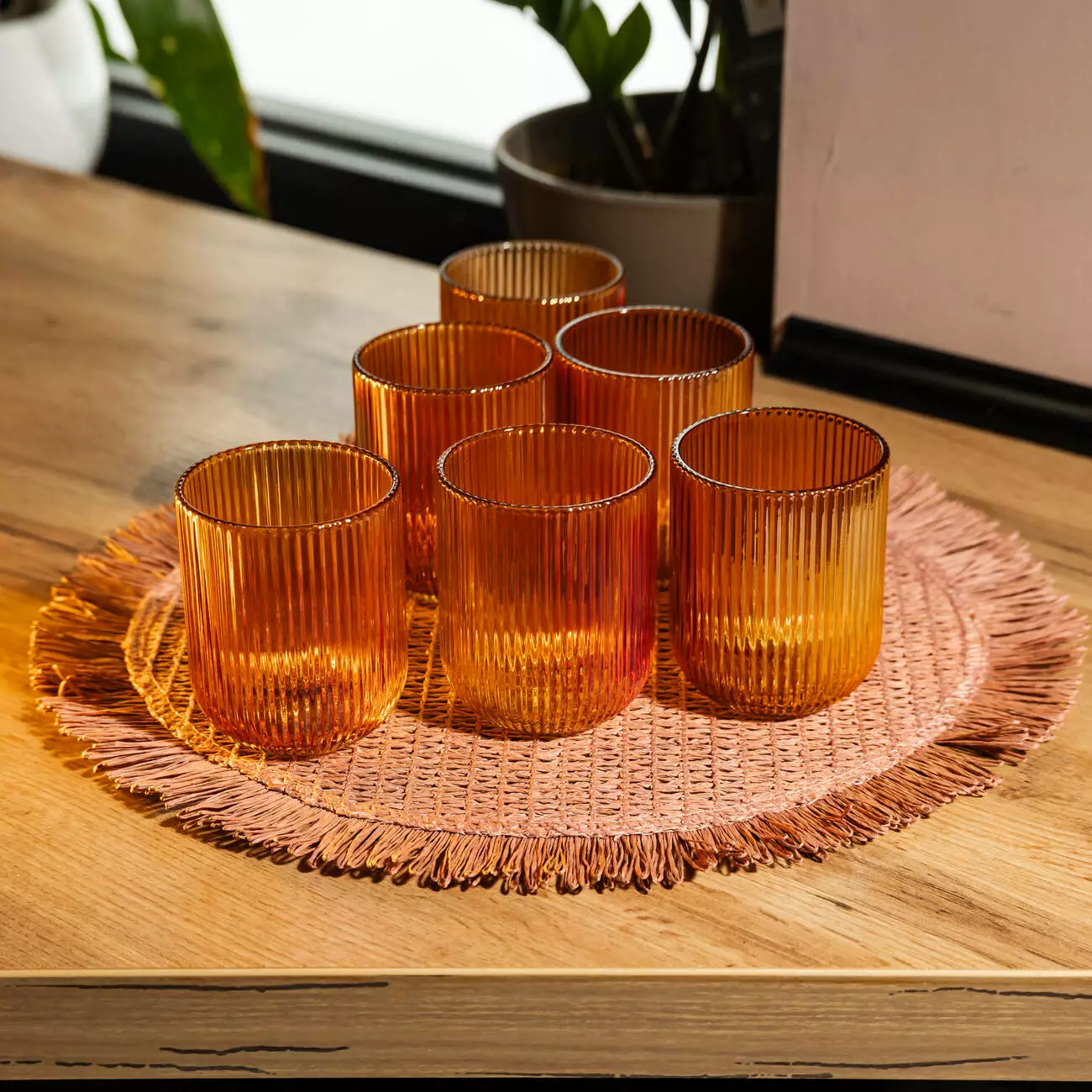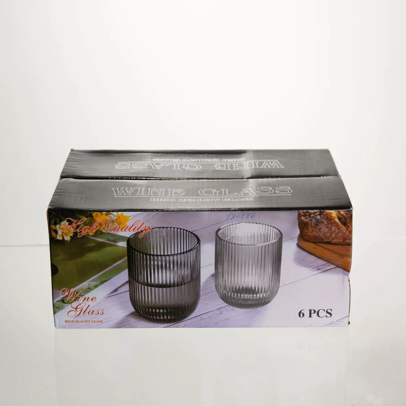 Поверхня склянок прикрашена ребристим візерунком із чітких вертикальних смуг, що створює гру світла, підкреслює прозорість скла та додає об’єму без зайвого декору. Текстурована поверхня також покращує захват і додає виробам виразності.