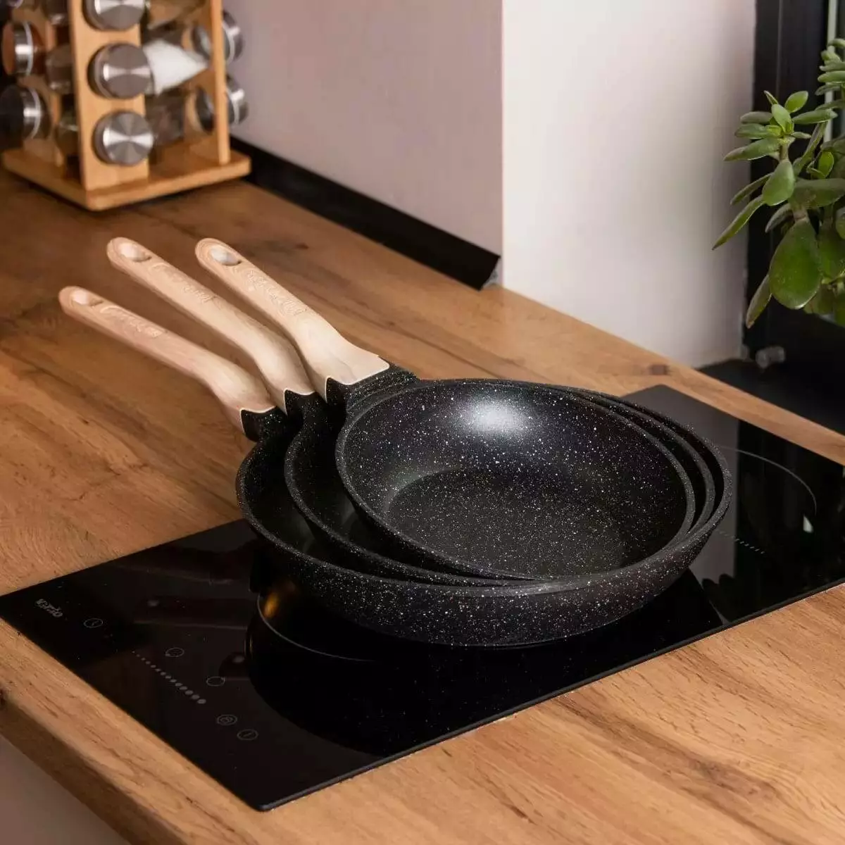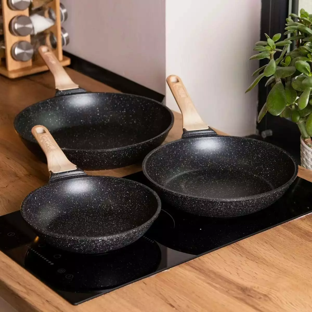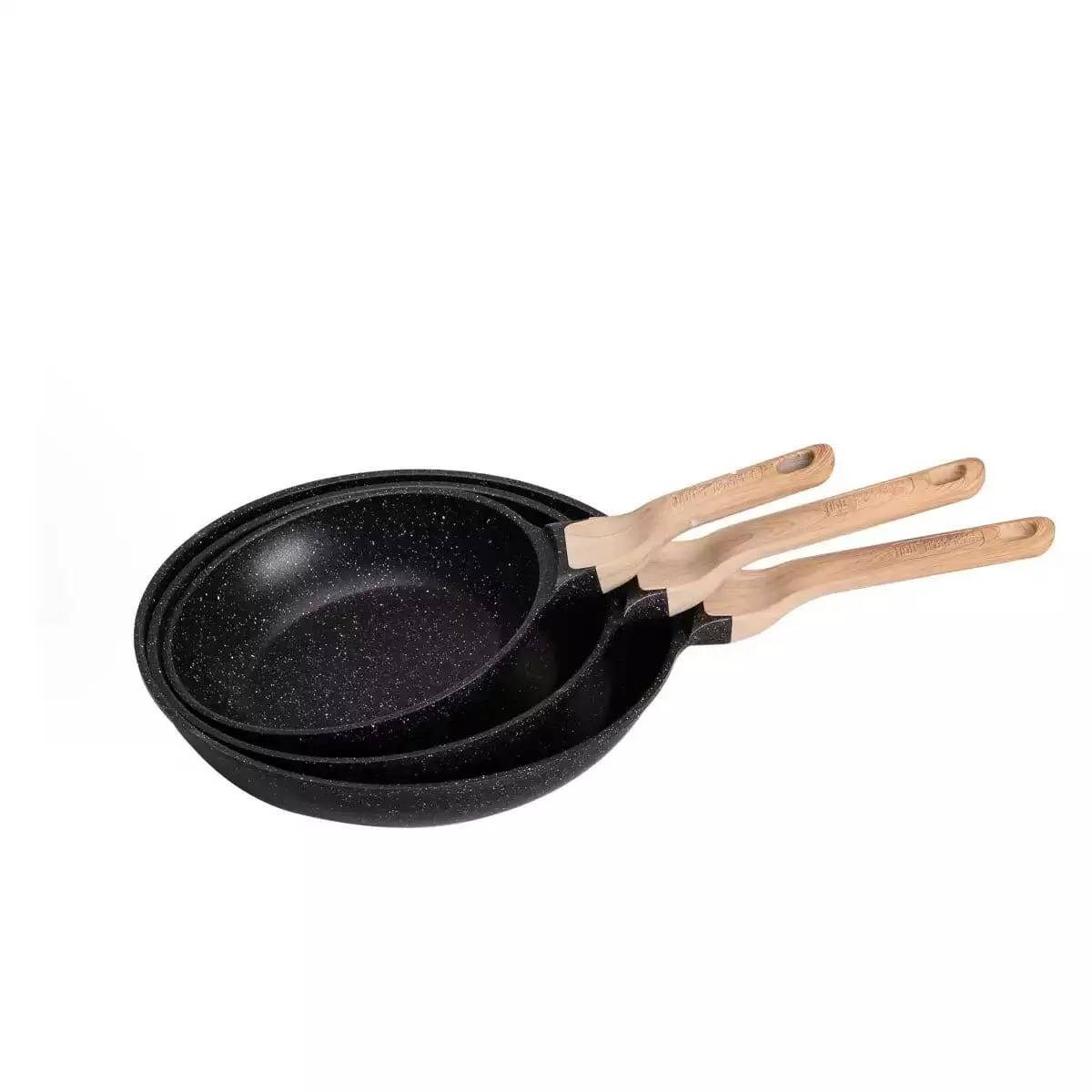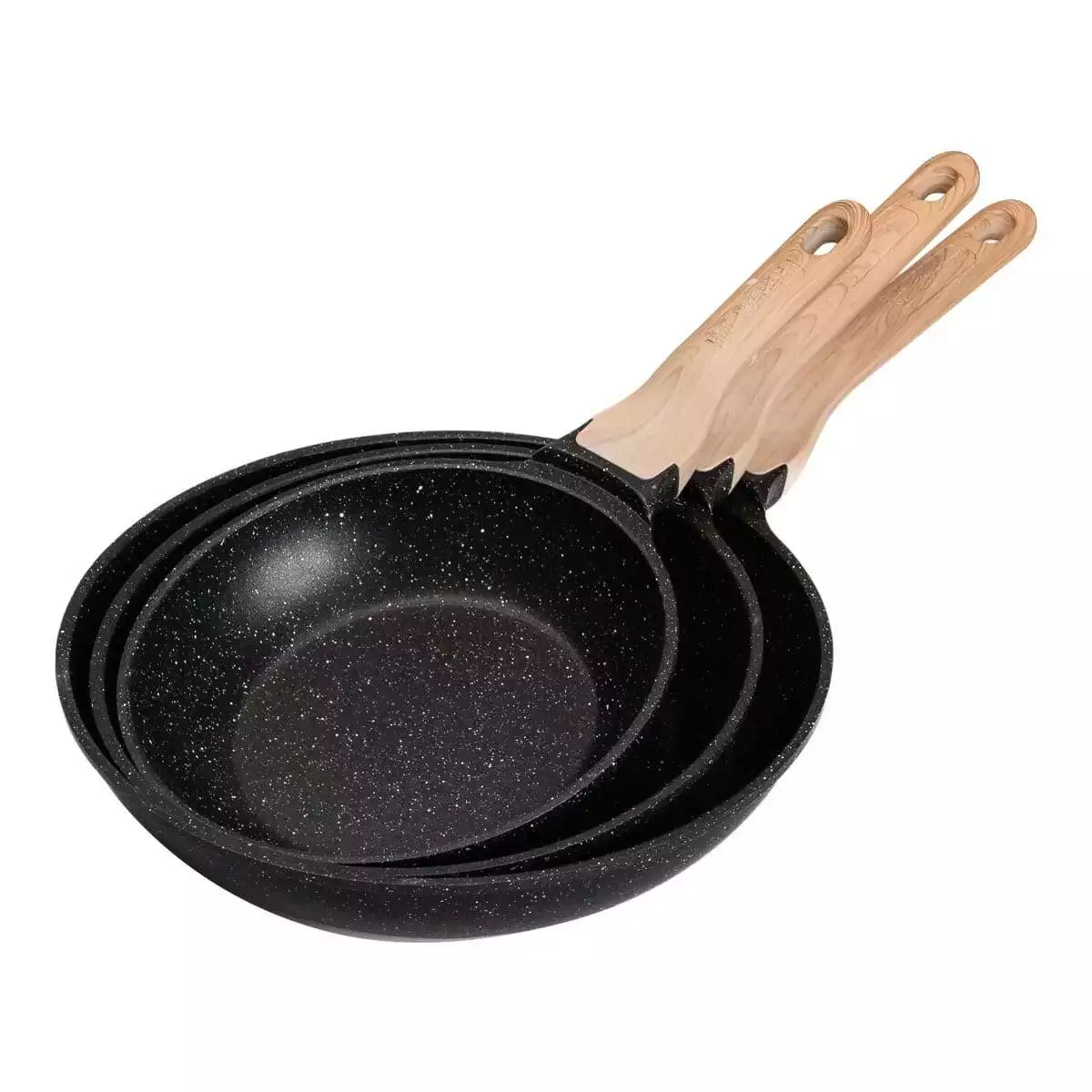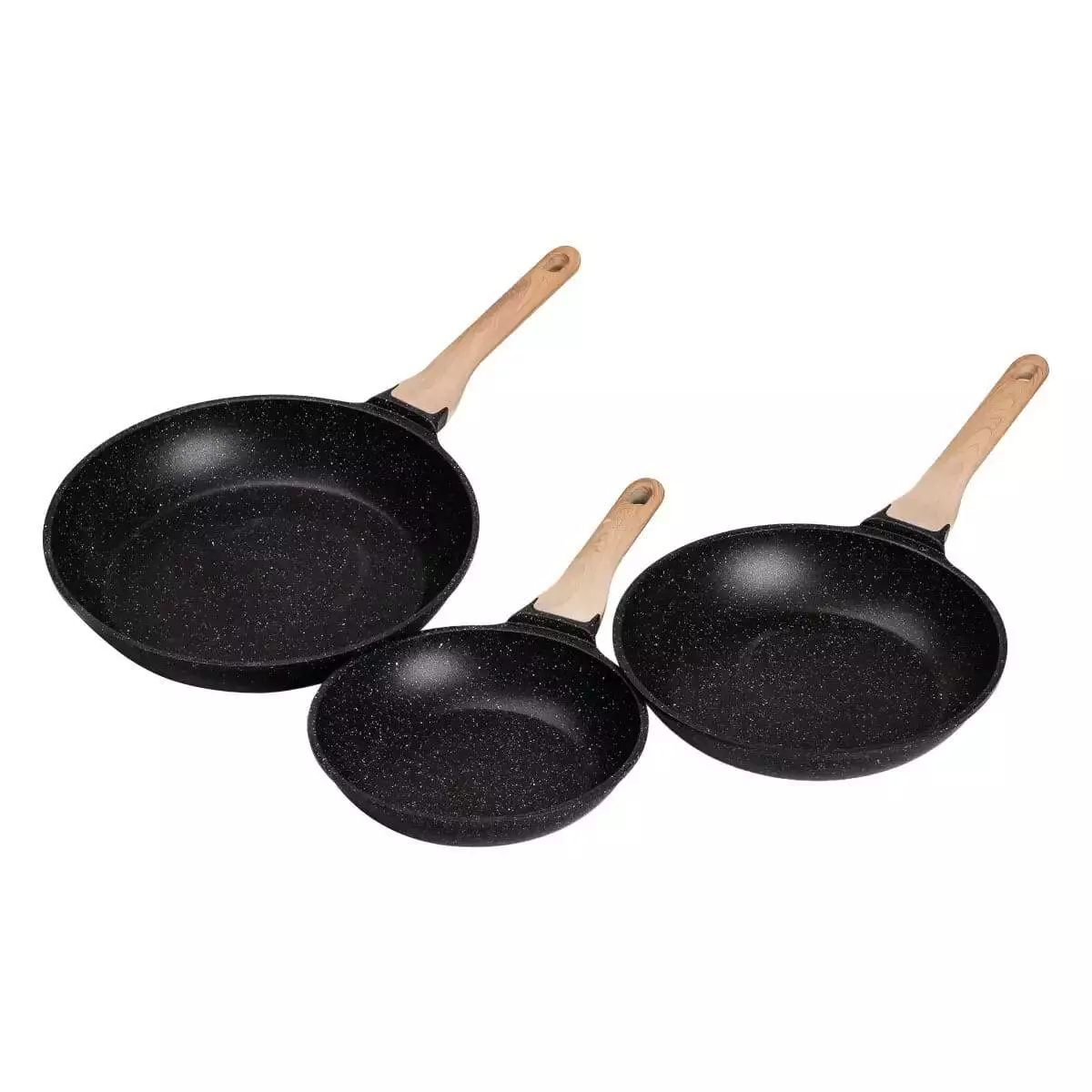 Набір сковорідок різного об'єму – універсальний варіант для приготування різноманітних страв. Посуд виготовлений з литого алюмінію, добре проводить тепло та забезпечує рівномірний прогрів інгредієнтів. Сковороди мають антипригарне мармурове покриття, завдяки чому можна готувати страви з мінімальною кількістю олії, а гладка внутрішня поверхня полегшує миття.