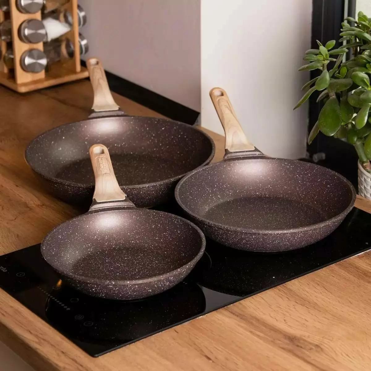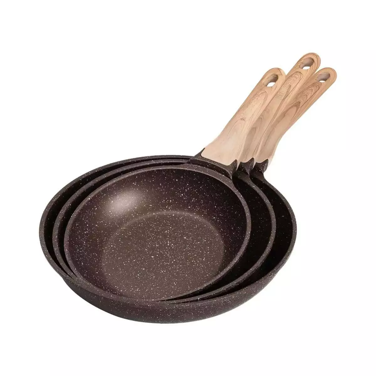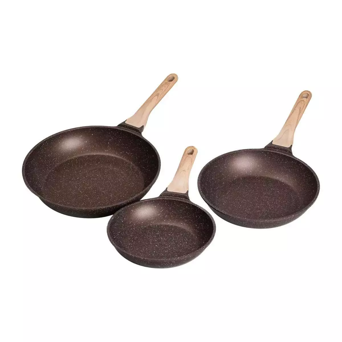 Набір сковорідок різного об'єму – універсальний варіант для приготування різноманітних страв. Посуд виготовлений з литого алюмінію, добре проводить тепло та забезпечує рівномірний прогрів інгредієнтів. Сковороди мають антипригарне мармурове покриття, завдяки чому можна готувати страви з мінімальною кількістю олії, а гладка внутрішня поверхня полегшує миття.