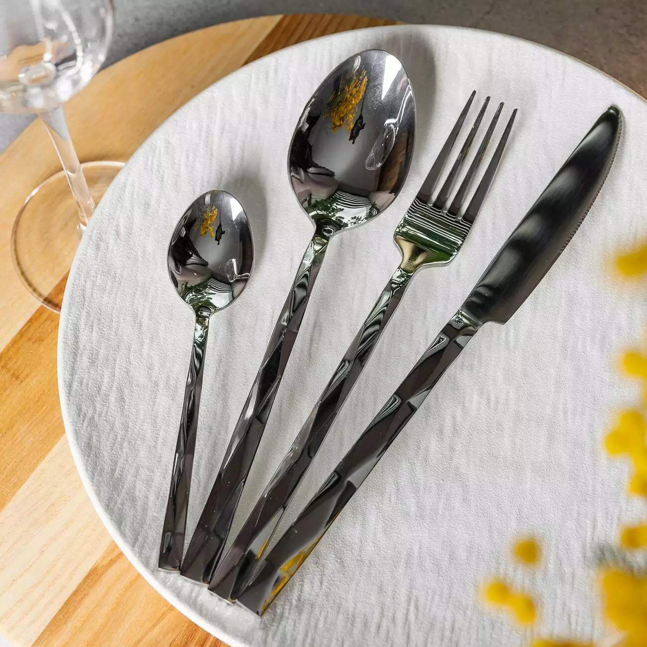 Набір столових приборів розрахований на 6 персон і включає 24 предмети. Виготовлений із високоякісної нержавіючої сталі з дзеркальною поверхнею, що надає елегантного вигляду та забезпечує стійкість до корозії. Фактурна обробка додає приємних тактильних відчуттів і покращує зчеплення під час використання.
