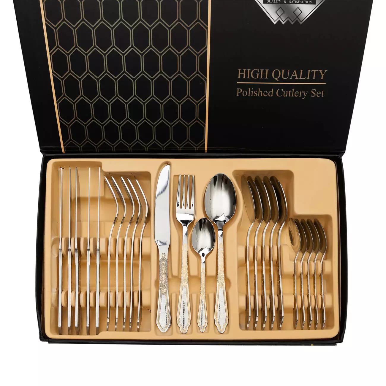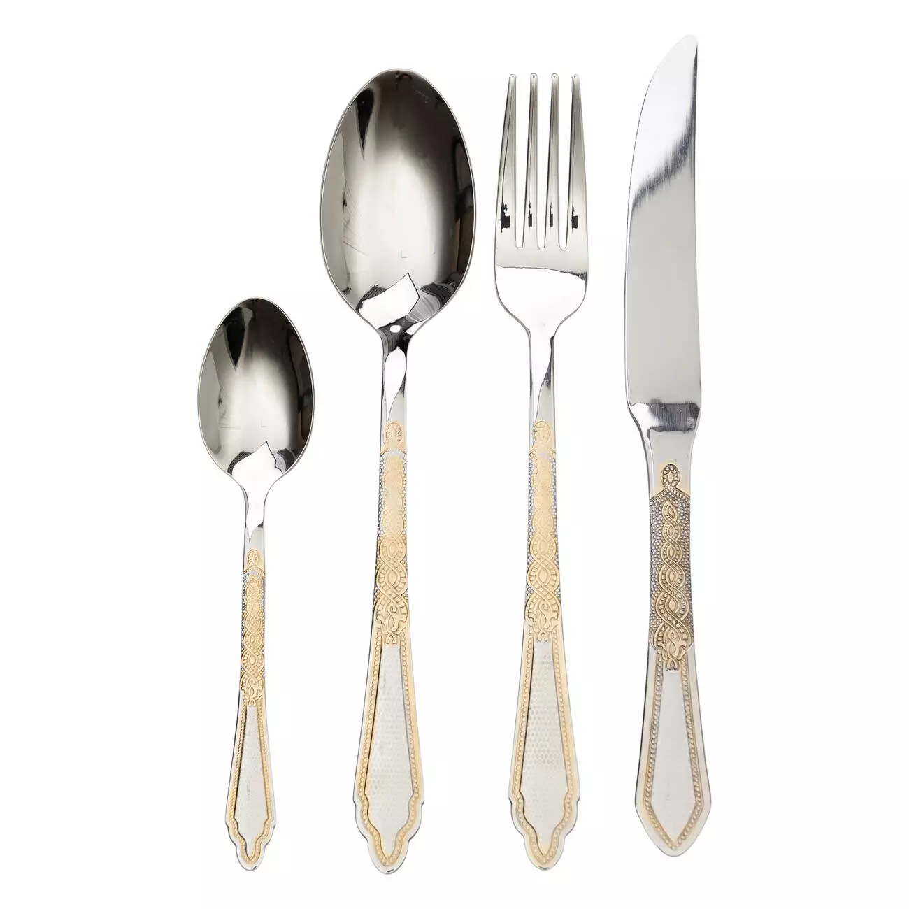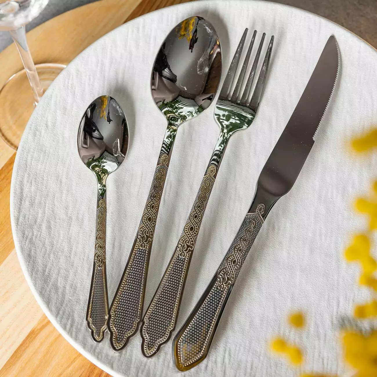 Набір столових приборів на 6 персон зі східним орнаментом, хром із золотом