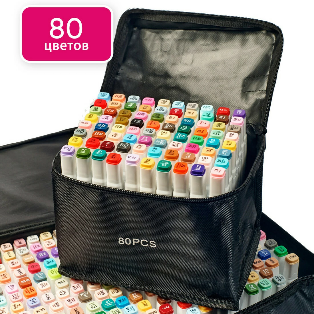 У наборі 80 маркерів різних кольорів. Корпус пластиковий, гладкий.