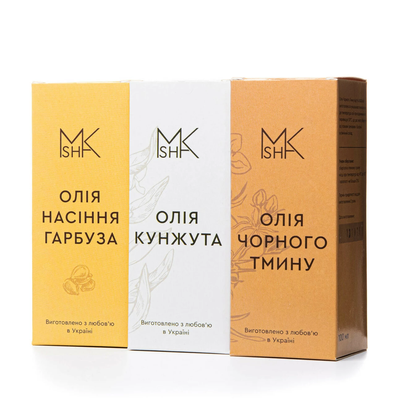 Склад набору: олія чорного тмину холодного віджиму, олія кунжутна холодного віджиму, олія гарбузова холодного віджиму.