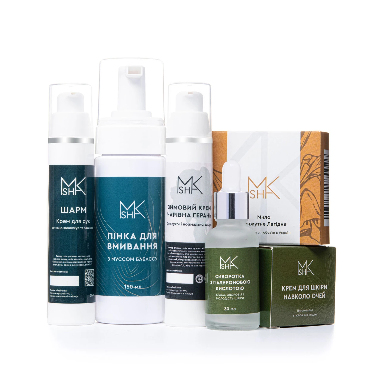 Склад набору: крем для обличчя «Чарівна герань», пінка для вмивання з мусом бабассу, крем для рук «Шарм», сироватка з гіалуроновою кислотою, крем для шкіри навколо очей, мило лагідне кунжутне.
