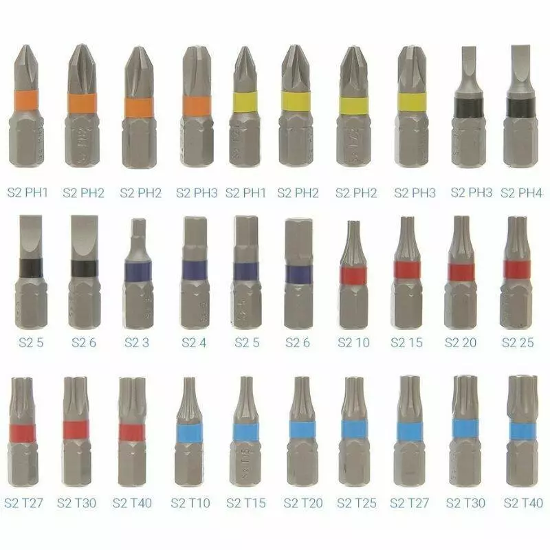 PH1, PH2, PH3, PZ1, PZ2, PZ3 , SL3.0, SL4.0, SL5.5, SL6.0, T10, T15, T20, T25, T27, T30, T40, T10H, T15H, T20H, T25H, T27H, T30H, T40H, H3, H4, H5, H6