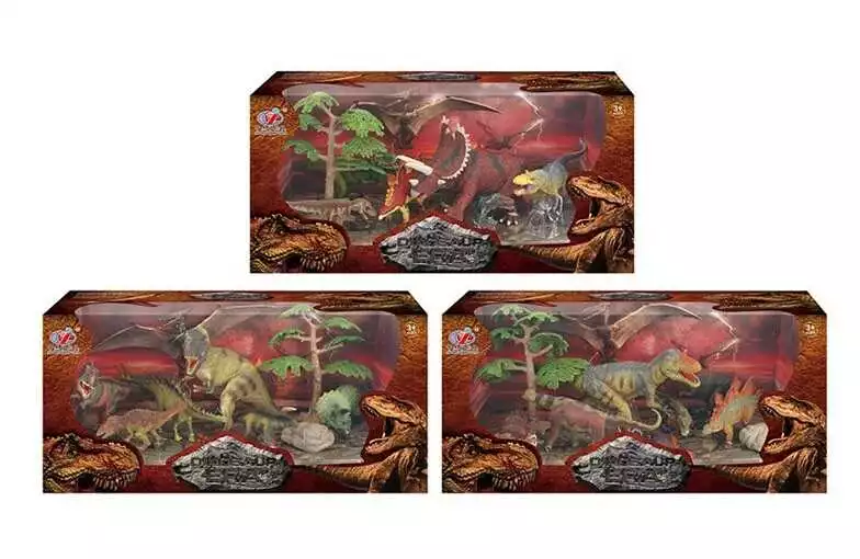 Набор динозавров Q 9899-222 (12/2) 3 вида, 9 элементов, 6 динозавров, аксессуары, в коробке