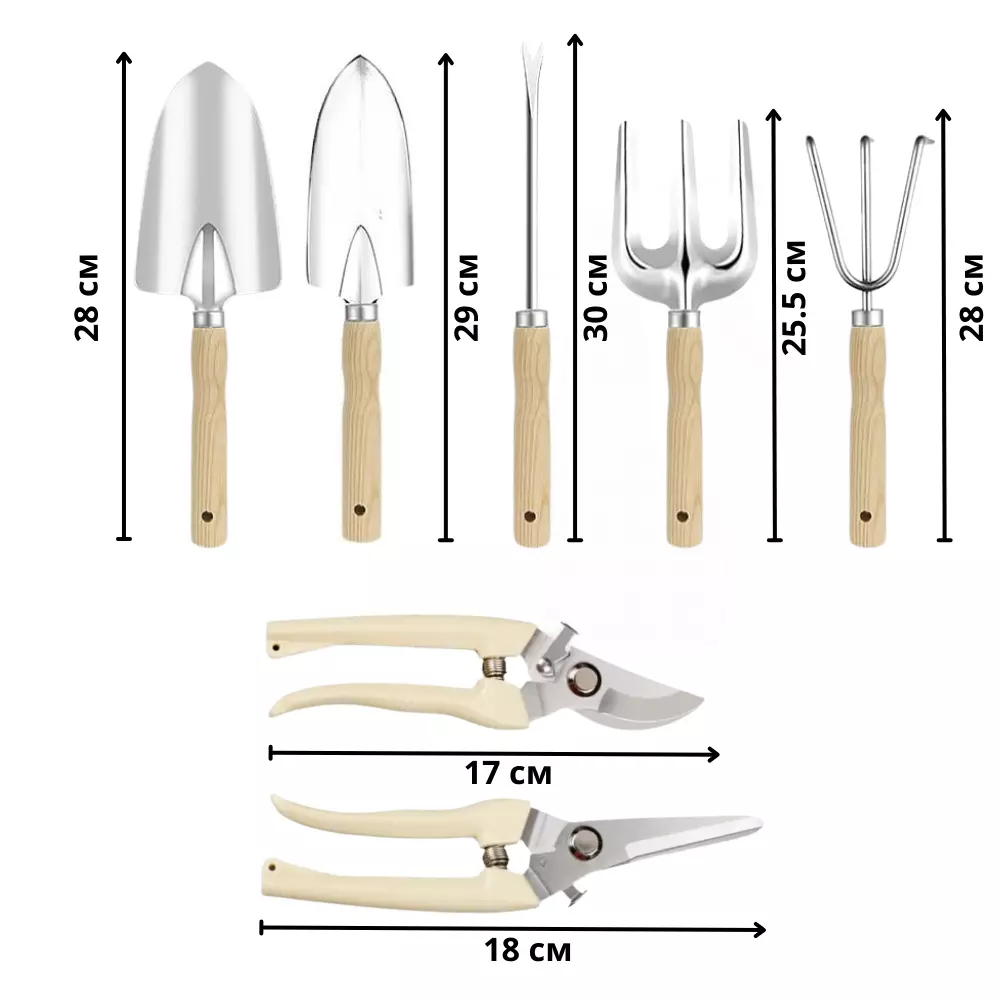корнеудалитель (30 см), вилы (25,5 см) и ручные грабли (28 см), а