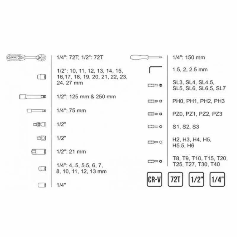 1½" - ⅜" с отверстием для воротка</li> <li>Насадки 1/4"