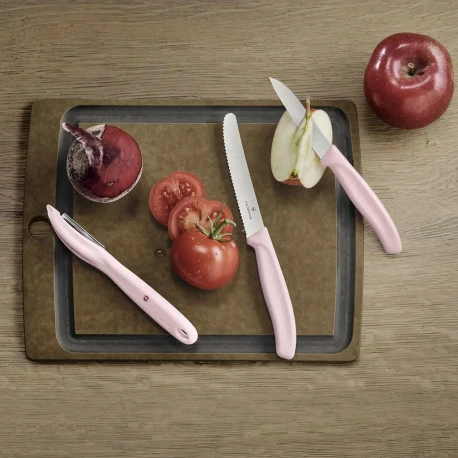 • ніж для чищення та різання томатів, довжина леза: 110 mm, колір рукоятки: світло-рожевий, заточка: хвилясте лезо з округленим кінцем