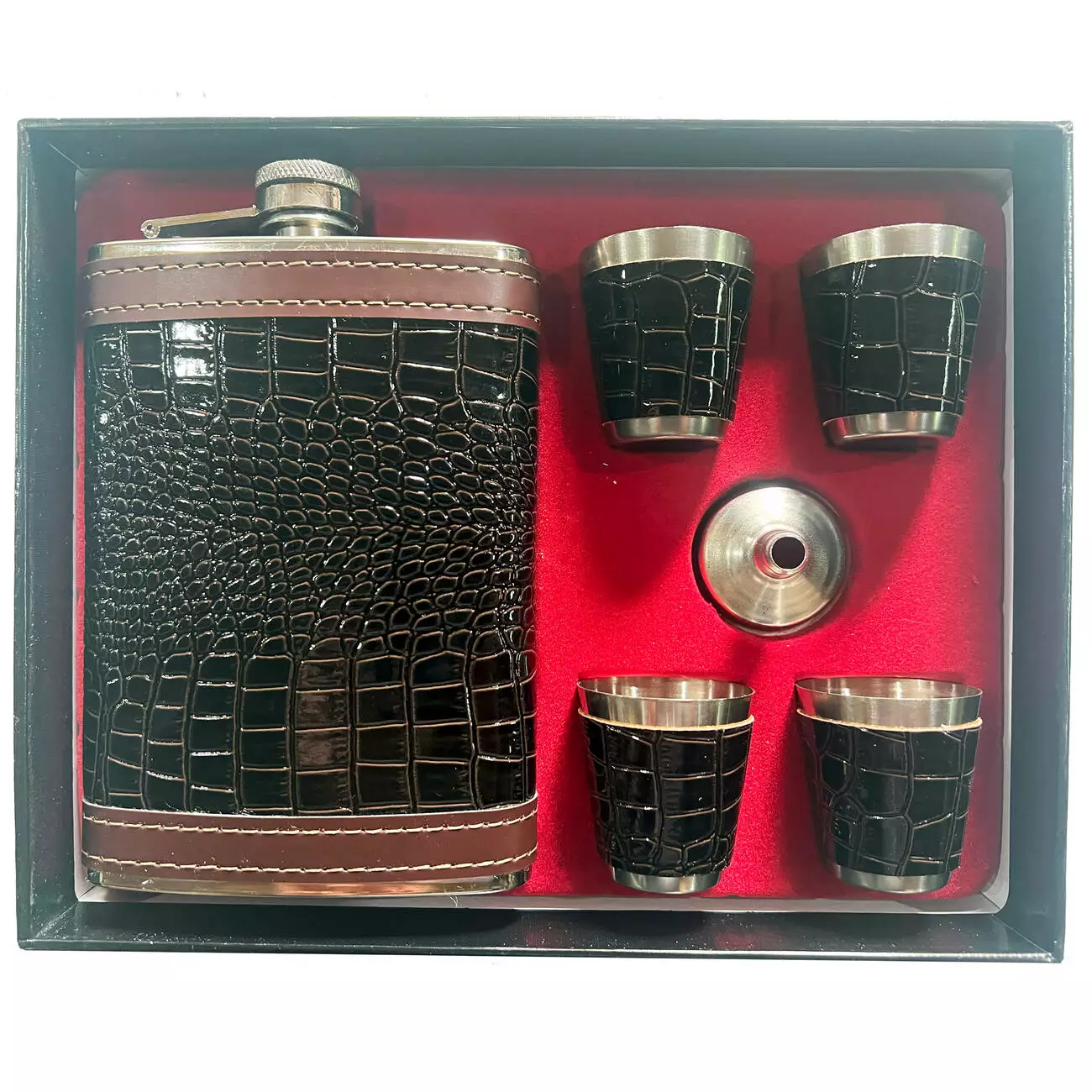 Элегантный подарочный набор с фляжкой объёмом 270 мл, четырьмя стопками и воронкой. Изделия оформлены в стильной отделке под кожу с тиснением "под крокодила". Отличный выбор для подарка мужчине.