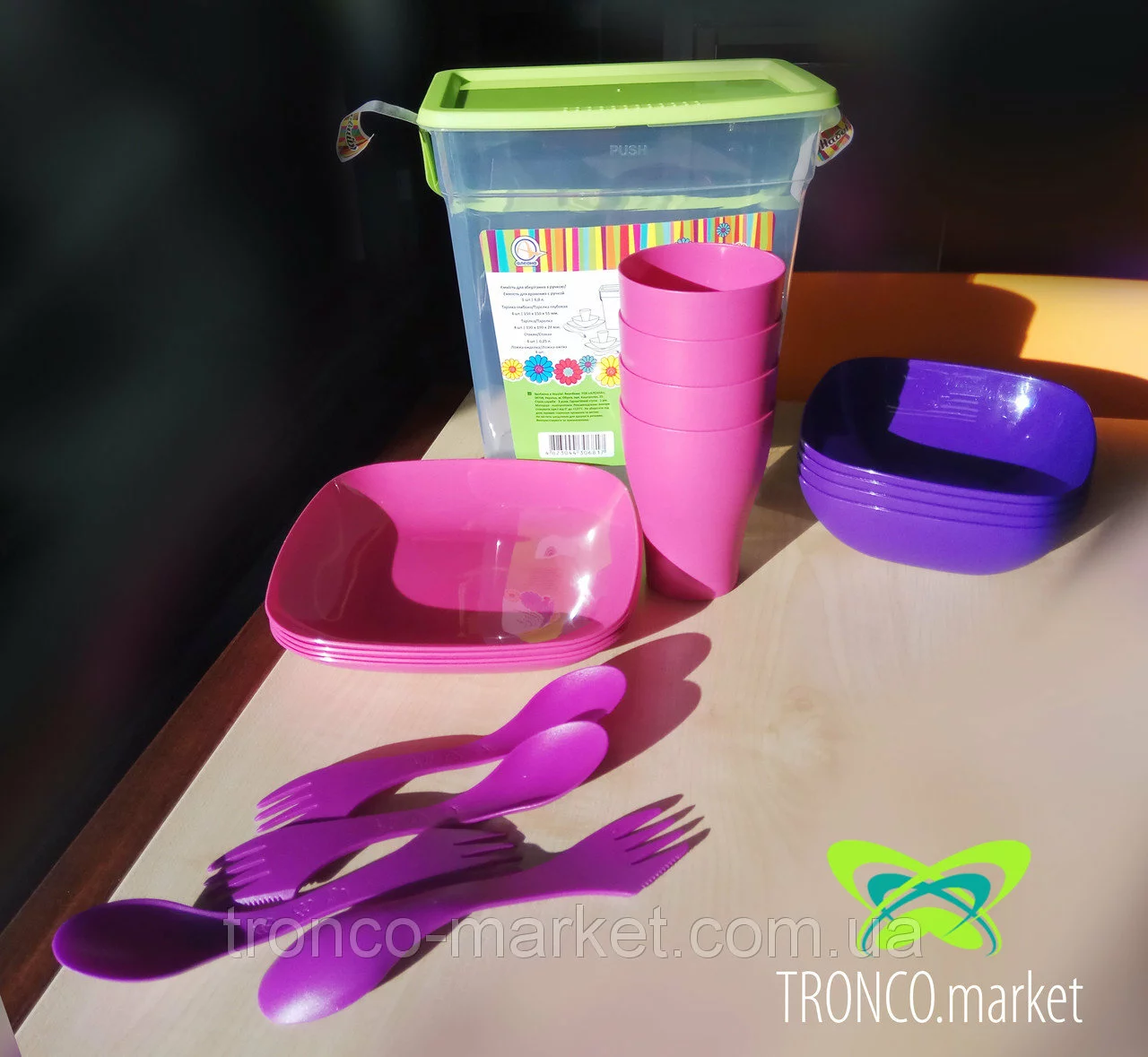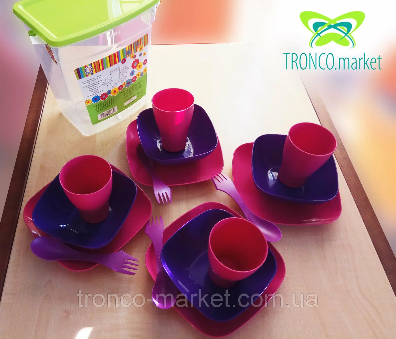 Современный и стильный подарок к любому празднику! А главное полезный - такой универсальный набор красивой посуды всегда будет нужным и полезным в походе, на природе. Каждая хозяйка по достоинству оценит дизайн,цветовую гамму и комплектацию такого подарка. Набор пластиковой посуды на 4 персоны будет радовать яркими принтами . Удобная коробка позволит компактно хранить и транспортировать такой набор посуды.