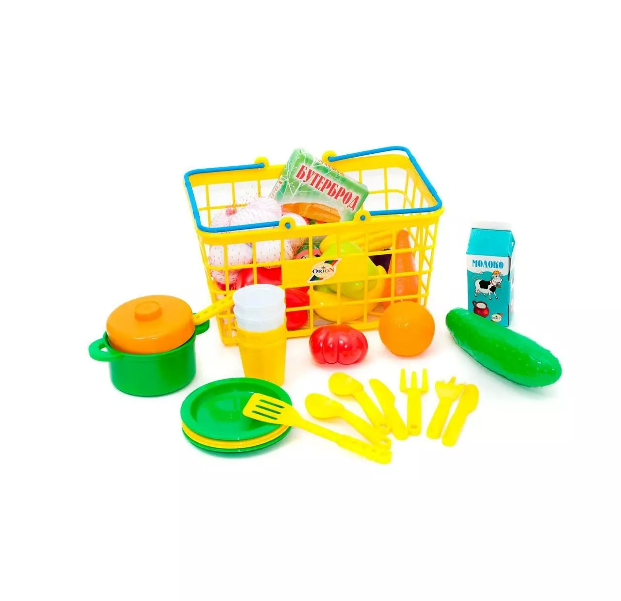 корзинка, разные фрукты, овощи и муляжи продуктов питания. Сколько