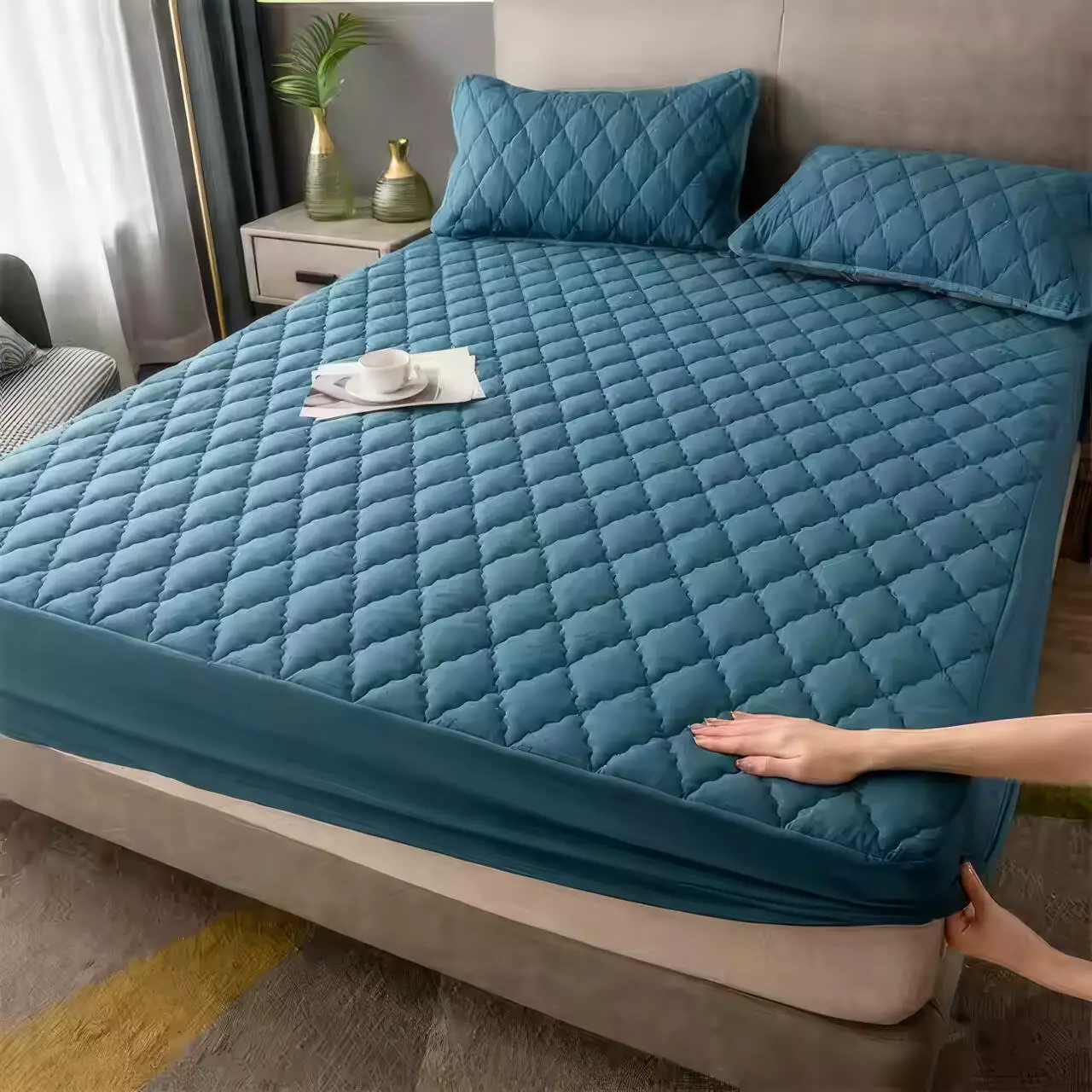 Комплект включает водонепроницаемую простыню на резинке и две