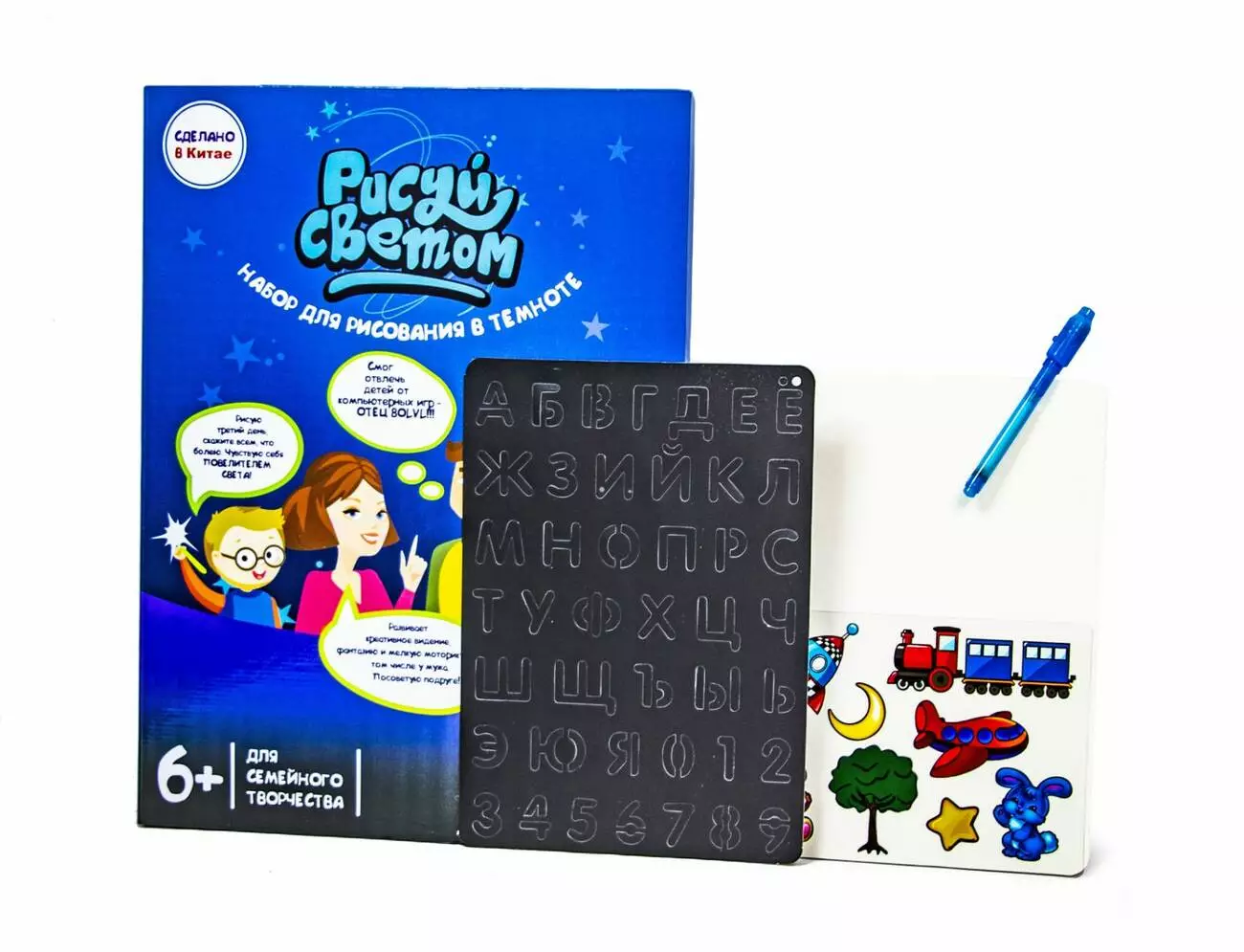 <p>НАБОР ДЛЯ РИСОВАНИЯ В ТЕМНОТЕ – РАЗВИВАЕТ НАВЫКИ РИСОВАНИЯ, ФАНТАЗИЮ И ИНТЕЛЛЕКТ</p><br /> <br /> <p>Основа набора это планшет Рисуй Светом c покрытием накапливающим свет и ручка-фонарик. Достаньте планшет из светонепроницаемого чехла, прикоснитесь маркером к планшету, одновременно удерживая нажатой кнопку на маркере, и начинайте рисовать.</p><br /> <br /> <p>Регулируйте расстояние от маркера до поверхности планшета. Чем ближе маркер к планшету, тем четче и ярче линия. По мере отдаления маркера, световая линия рассеивается. Перпендикулярное расположение маркера позволяет рисовать наиболее ярко и четко.</p><br /> <br /> <p>Новые рисунки можно наносить поверх старых. В наборе есть трафареты, используйте их для обучения и творчества. Набор предназначен для детей от 6 лет.</p><br /> <br /> <p> </p><br /> <br /> <p><strong>В КОМПЛЕКТ "РИСУЙ СВЕТОМ" ВХОДИТ:</strong></p><br /> <br /> <ul><br /> <li>Планшет из пластика А3 (30?42 см)</li><br /> <li>Ручка с фонариком</li><br /> <li>Трафарет </li><br /> <li>Светящиеся наклейки</li><br /> <li>Инструкция</li><br /> <li>Коробка</li><br /> </ul><br /> <br /> <p>* Характеристики и комплектация товара могут изменяться производителем без уведомления</p><br /> <br /> <p> </p><br /> <br /> <p><iframe frameborder="0" height="315" src="https://www.youtube.com/embed/OpEGwIsExek" title="YouTube video player" width="560"></iframe></p><br />