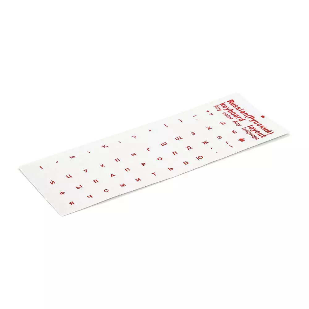 Прозорі наклейки на клавіатурі з червоними літерами Рус. для зручності набору тексту російською мовою.