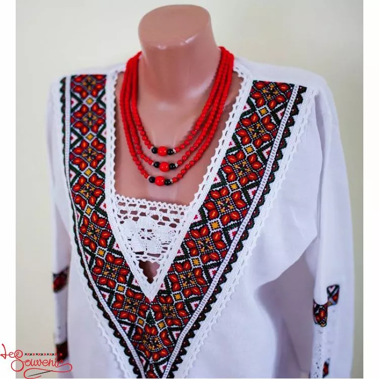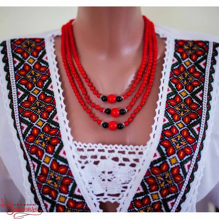 Червоні буси з чорними намистинками 3-ка від гуртівні Leosouvenir – це красиво і вишукано на тлі української вишиванки.