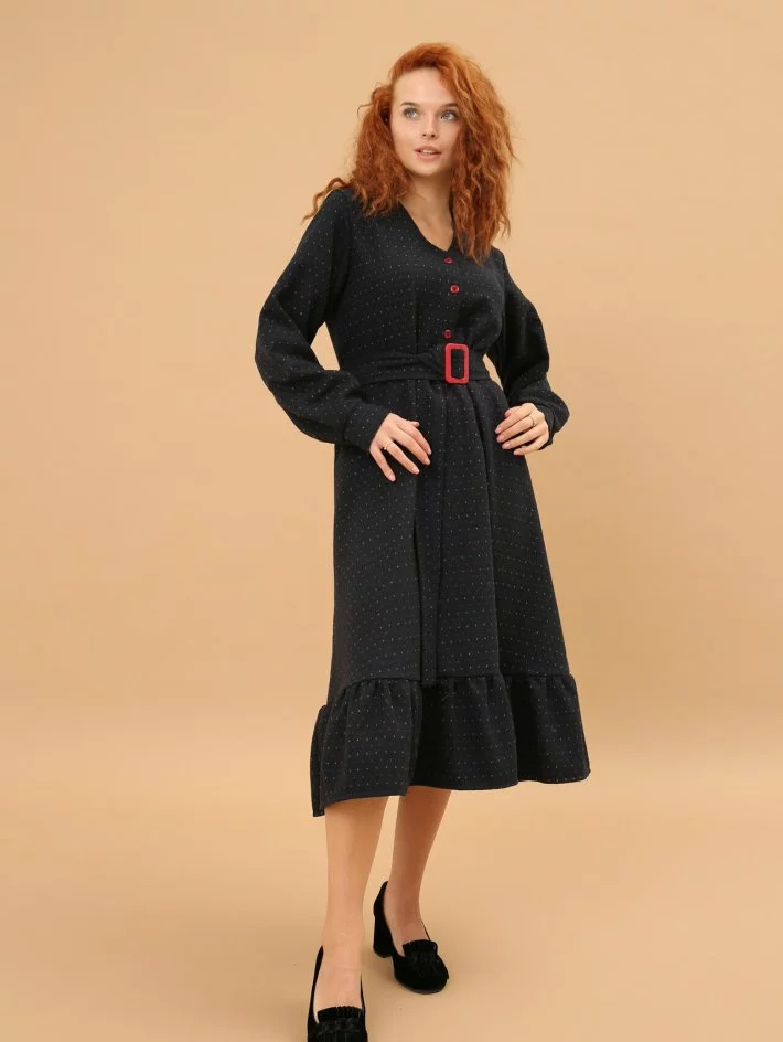 Напівприталена сукня з яскравими ґудзиками та пряжкою на поясі.