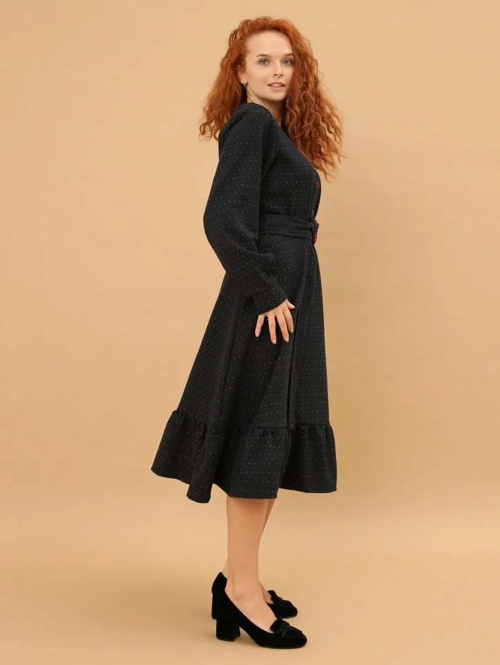 Напівприталена сукня з яскравими ґудзиками та пряжкою на поясі.