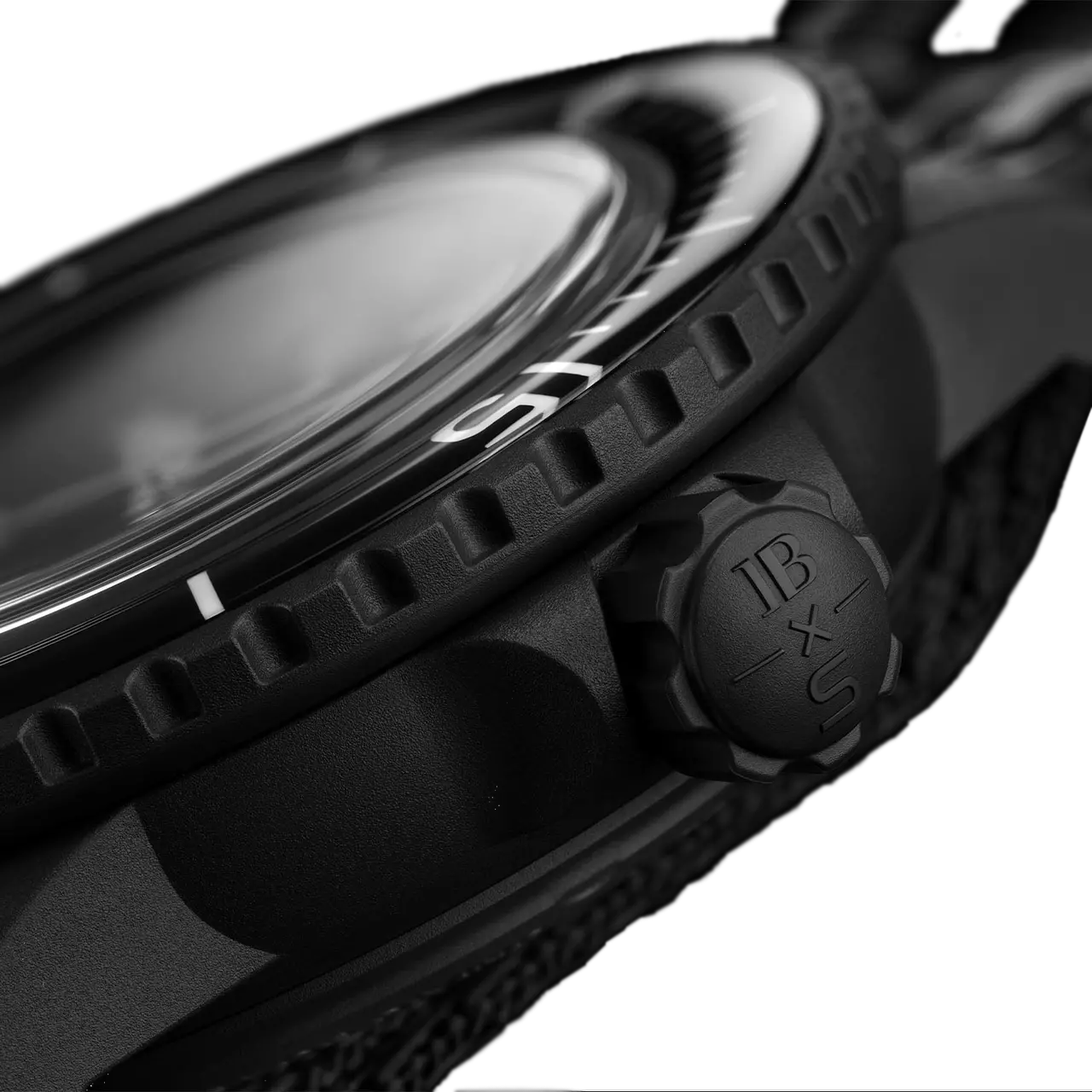 Глубокий черный корпус и заводная головка часов OCEAN OF STORMS, изготовленные из биокерамики, отражают непрекращающиеся силы природы, воплощенные в бурях океана. Циферблат с черной полировкой и индикатором даты между отметками 4 и 5 часов демонстрирует элегантность и функциональность этой модели. Ремешок НАТО, изготовленный из переработанных рыболовных сетей, символизирует устойчивость и экологическую осознанность.