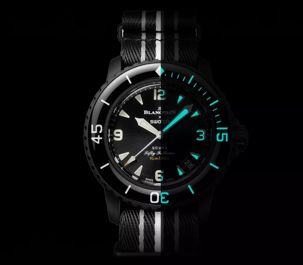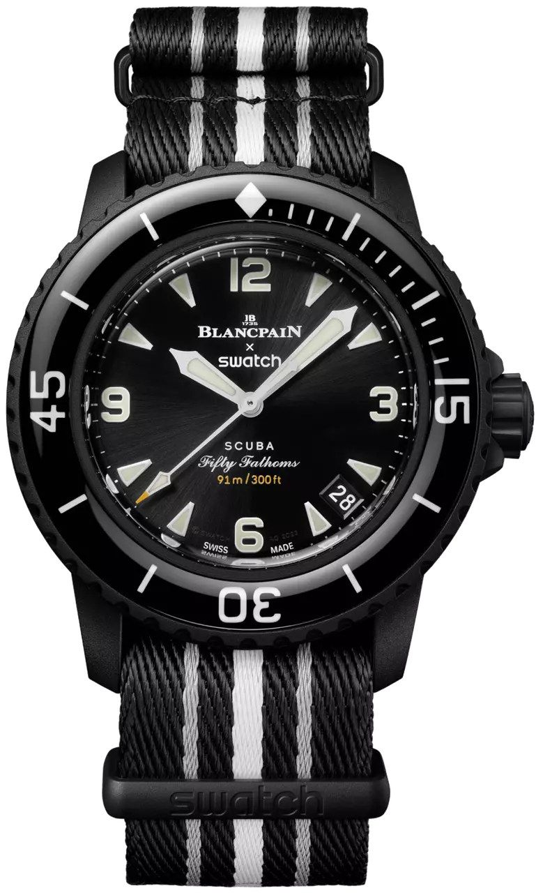 Пять моделей Blancpain × Swatch изготовлены из биокерамики – уникального запатентованного композита, на две трети состоящего из керамики, и на одну треть – из биоматериалов на основе касторового масла. Цветовая гамма совместного творения подчеркивает, что это не классические часы Blancpain. Однако, знатоки и любители брендов сразу же узнают характерные особенности знаменитых Fifty Fathoms, а также отсылки к коллекции Swatch Scuba.