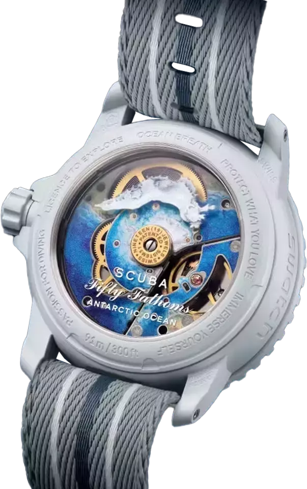 Модель ANTARCTIC OCEAN, посвященная одной из самых экстремальных зон нашей планеты, оснащена двухцветным индикатором контакта с водой. Этот датчик, расположенный возле 6-часовой отметки на циферблате холодного серого оттенка, является важной особенностью военных водолазных часов и пользуется большой популярностью у коллекционеров.