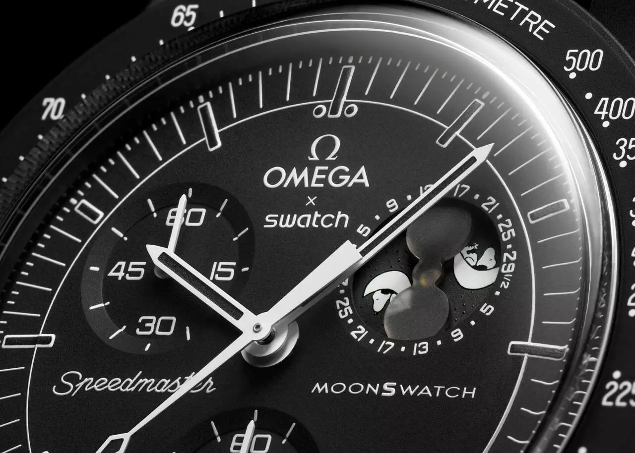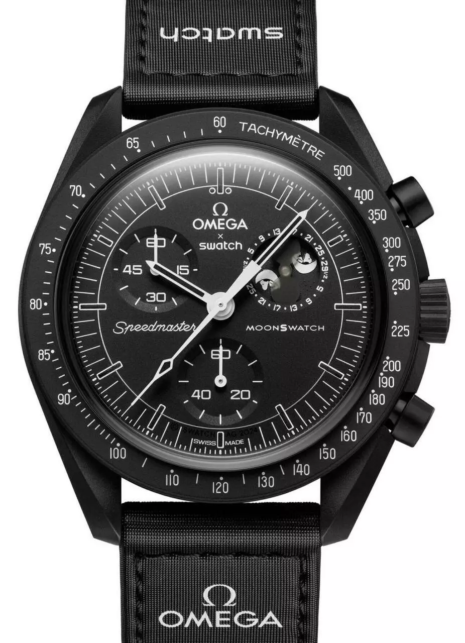 Часы Swatch x Omega Bioceramic MoonSwatch «Mission to the Moonphase — New Moon» — элегантная модель, полностью выполненная в черной цветовой гамме. Эта модель выделяется функцией определения фазы черной луны, возможно, самым поэтичным из всех часовых усложнений. Снупи, который был связан с пилотируемыми космическими полетами с 1960-х годов, изображен лежащим на Луне на диске фаз Луны, который вращается на дополнительном циферблате в положении «2 часа». В ультрафиолетовом свете на уникальном дополнительном циферблате раскрывается скрытая цитата из комикса о Снупи, расположенная среди полумесяцев и звезд.
