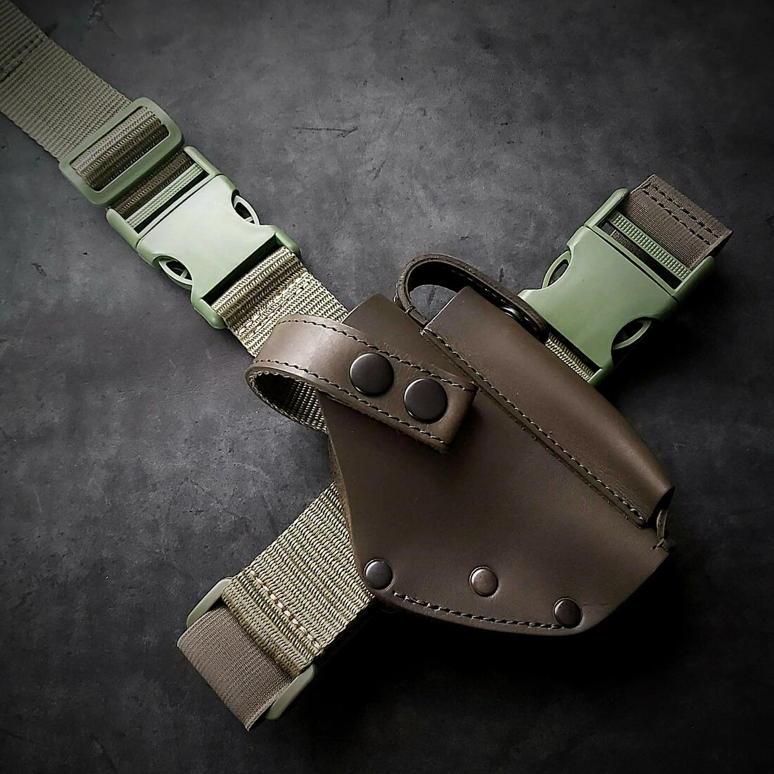 Шкіряна стегна кобура під ПМ. Виконана із натуральної щільної шкіри. Колір темна олива.