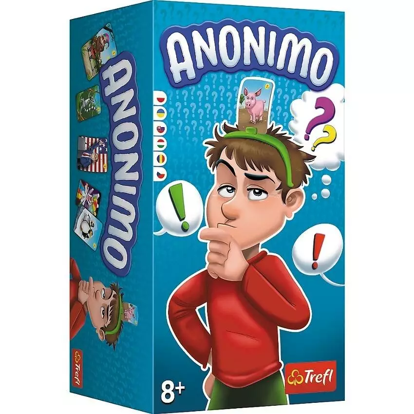 <p><em>Вгадай, хто ти! В Anonimo гравці намагаються вгадати розміщені картки вкладені в обруч. Покрутіть колесо та подивіться, які додаткові правила чекають на вас у цьому раунді.<br></em></p><p><strong>Вміст коробки</strong><br></p><ul><li> <em> 56 двосторонніх карток з ролями</em></li><li><em> 4 пов'язки з ручками</em></li><li><em> стрілка і гральне поле для підказок</em></li><li><em> 24 бали жетони</em></li><li><em> 6 спеціальних карток</em></li><li><em> інструкція</em></li></ul>