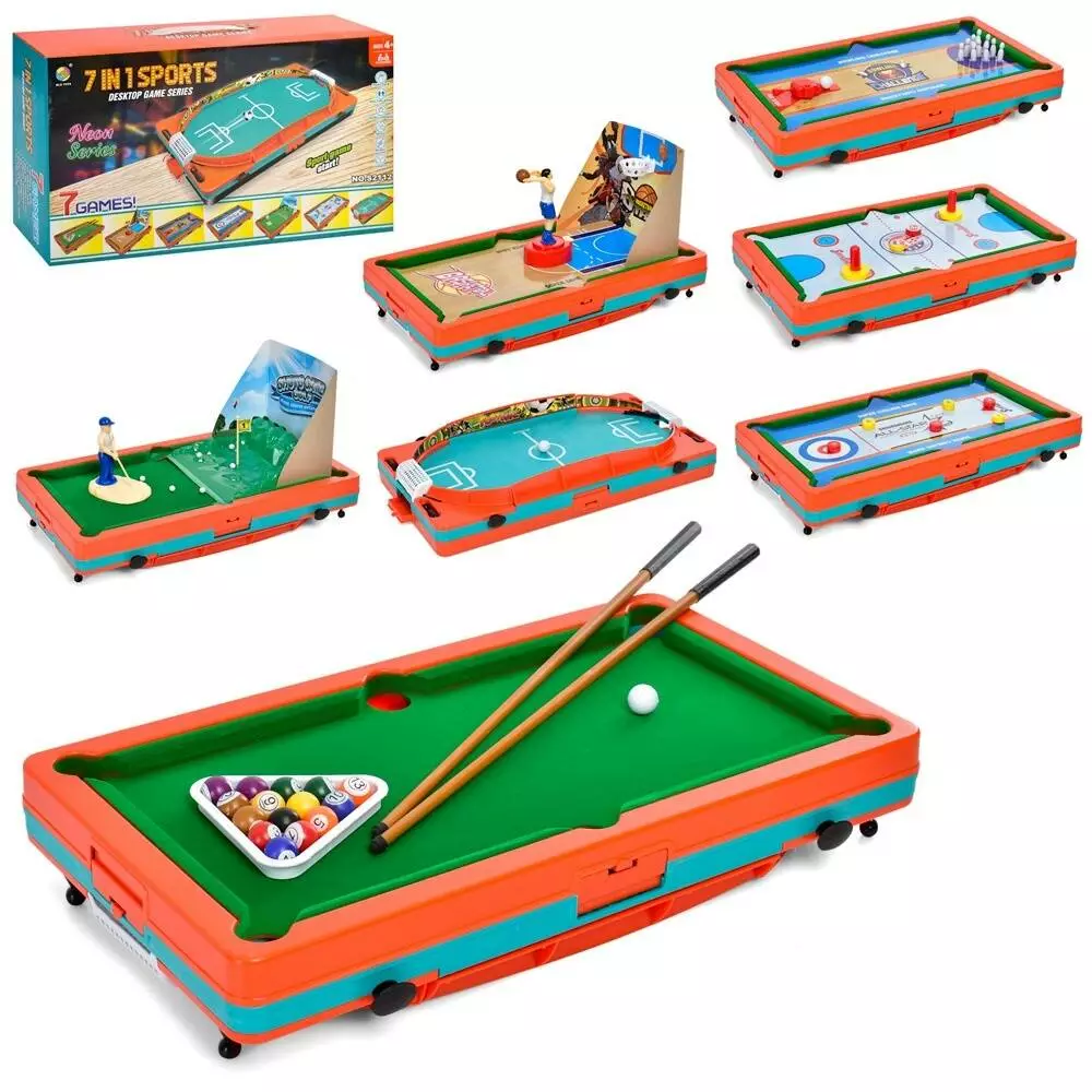 Настільна гра S2112 7в1,.ігрове поле47-26см.,.кий3шт., кульки, кеглі, фігурки, кор., 48-28-12см.