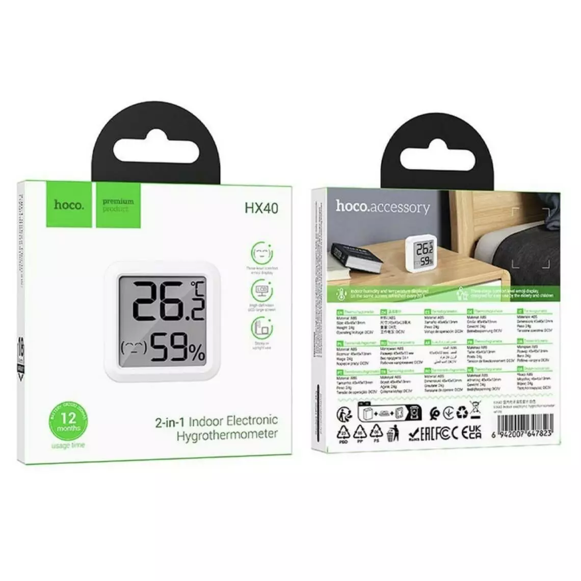 Настільний електронний гігрометр та термометр Hoco HX40 - це компактний і практичний пристрій для контролю температури та рівня вологості в приміщенні. Він ідеально підходить для використання вдома, в офісі або будь-якому іншому закритому просторі. На чіткому LCD-дисплеї одночасно відображаються показники температури та вологості, що дозволяє швидко отримувати актуальну інформацію. Дані оновлюються автоматично кожні 30 секунд, забезпечуючи точність у режимі реального часу. Завдяки компактним розмірам пристрій легко розмістити на столі, полиці або закріпити на стіні.