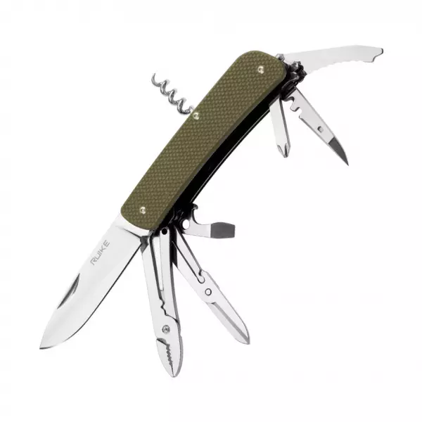 Для туристичних цілей як не можна краще підходить саме складаний ніж. Його зручно транспортувати, безпечно використовувати. Але особливо практичні для рибалок і туристів багатофункціональні моделі, як, наприклад, Ruike L41. Це якісний ніж з добре продуманим набором функцій. Він складається відразу з декількох інструментів з однією загальною рукояткою, які можна використовувати по черзі. Але головним серед них є саме ножа. Розмір леза цього ножа становить по довжині 85 мм. Товщина клинка по обуху не перевищує 3 мм. Вся його ріжуча кромка гладко заточена, що робить ніж універсальним в роботі з різними матеріалами. Крім того, доглядати за добре заточеним ножем простіше, ніж за серрейторным лезом.