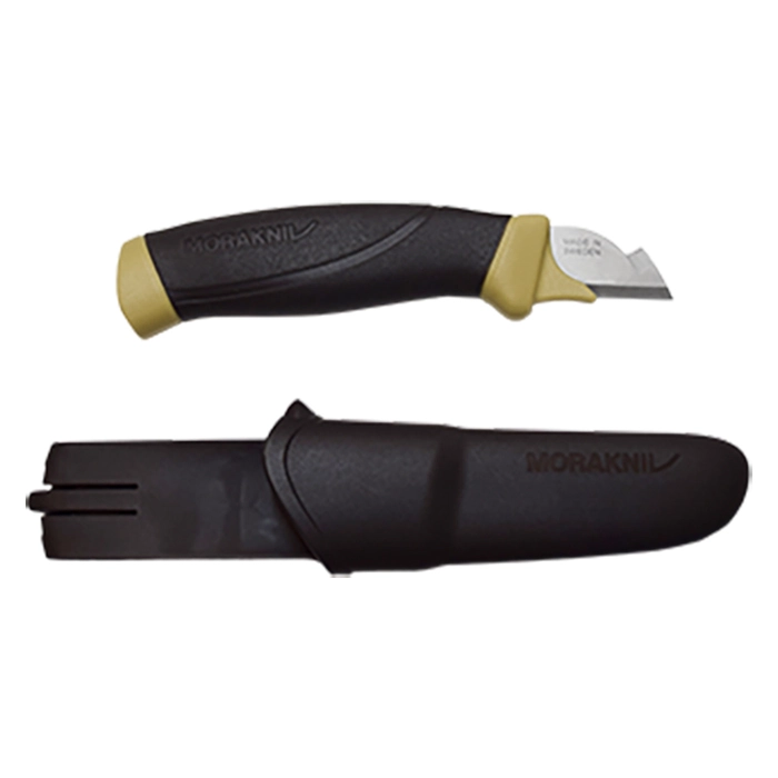 Представлене виріб відноситься до серії ножів Construction. Ці моделі розроблені в тісному партнерстві з різними фахівцями в сфері будівництва та ремонту. Такі ножі характеризуються зручністю, великою ефективністю, крім того, вони безпечні в застосуванні. Модель Morakniv Electrician's Knife призначена для зняття ізоляції, а також зачистки, обрізки та обробки проводів. Може бути корисна майстрам даного профілю, допоможе вам у побуті в певних ситуаціях. Ніж нескладною, виготовлений із застосуванням надійної сталі, захищеної від корозії. Висока твердість леза – близько 60 одиниць за шкалою Роквелла. Рукоять ножа виконана з використанням гуми і полімеру.