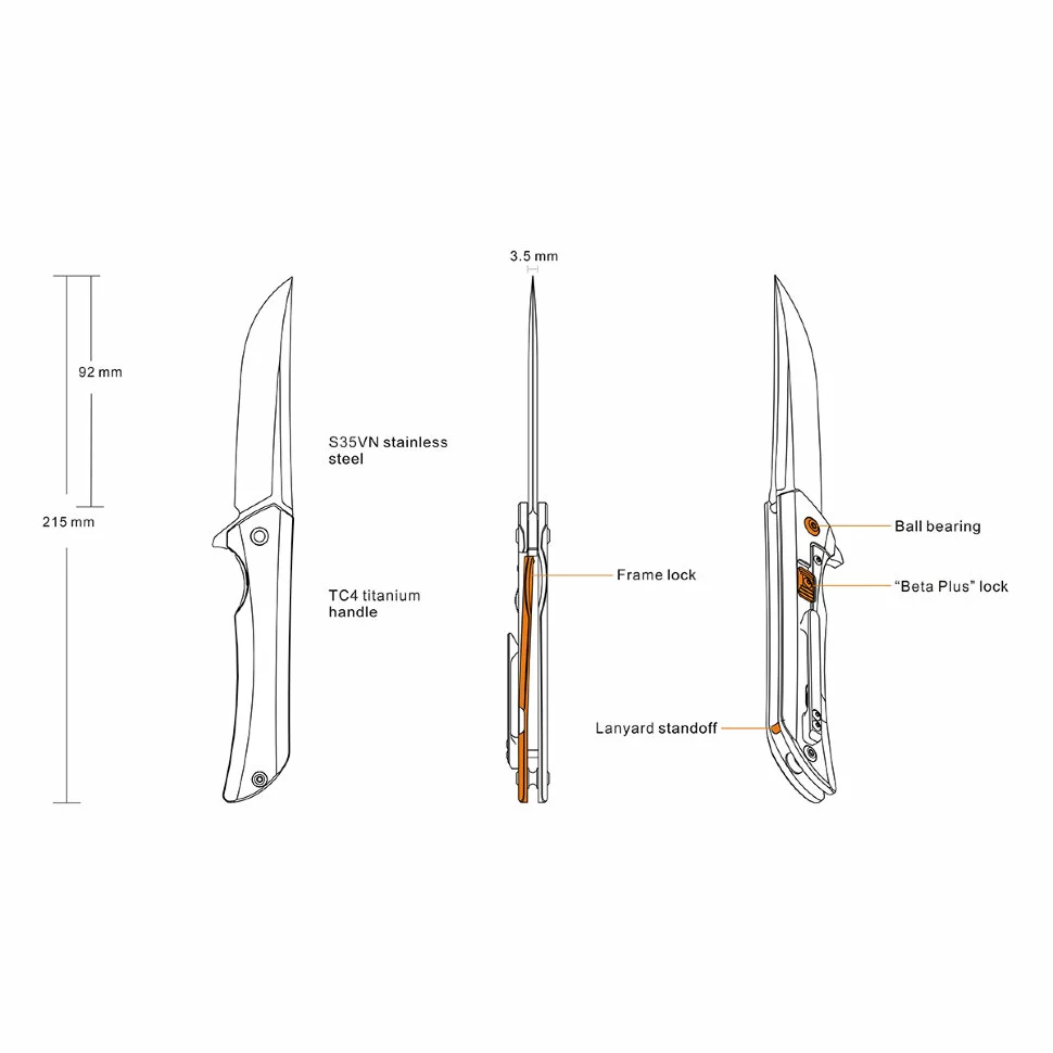 Новинка являє собою складний туристичний примірник, який запросто поміститься в кишені, сумці або рюкзаку. Тип заточення – прямий. Форма леза – normal blade. Це універсальний, класичний профіль, який в побуті носить назву «фінка». На сьогоднішній момент ця форма – одна з найбільш популярних різновидів клинка. Довжина клинка 9,2 сантиметри, виконаний з нержавіючої сталі марки S35VN. Цей металевий сплав являє собою поліпшений варіант CPM S30V. Ножі з цієї сталі характеризуються більш високими показниками в'язкості при ударних навантаженнях, а також легше піддаються поліровці під час виготовлення.