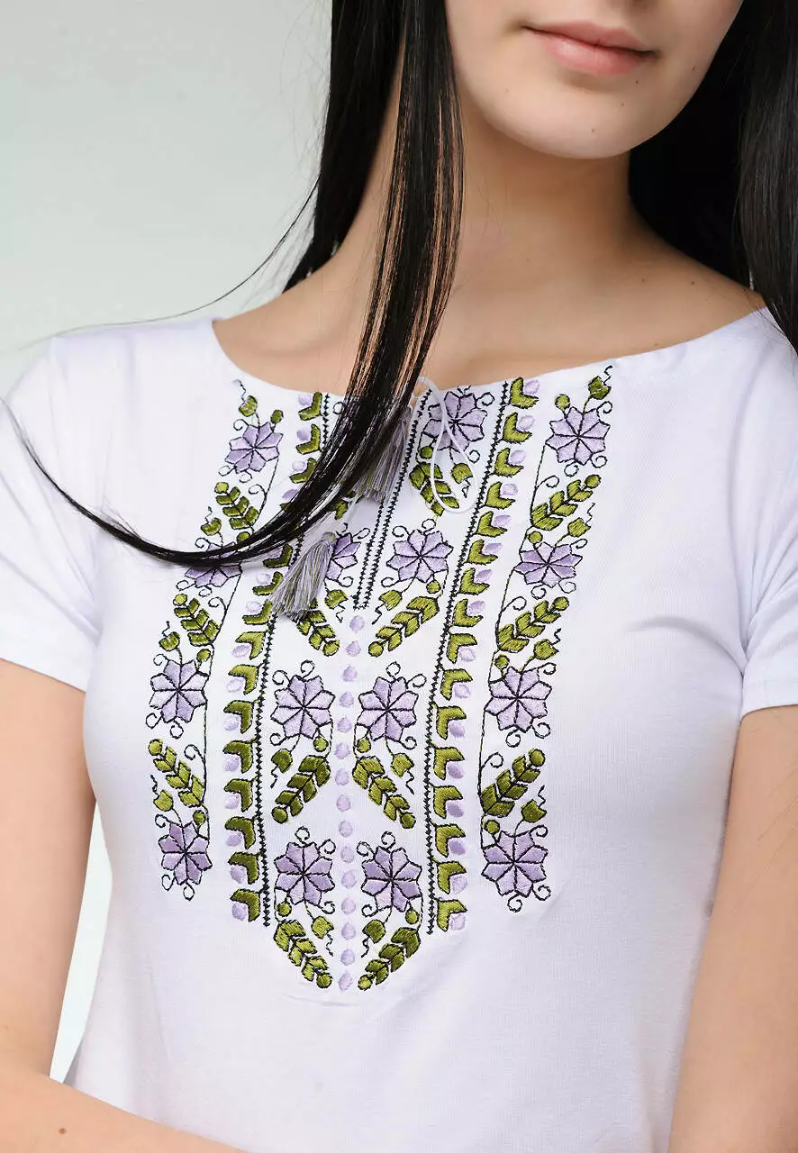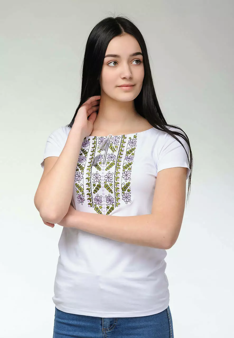 Акуратна ніжно біла жіноча вишита футболка є яскравим підтвердженням багатства української вишивки. Для створення даної моделі наші дизайнери використали давні зразки вишивки, але осучаснили їх. У моделі сміливо поєднуються нотки зелених та фіолетових кольорів, які розміщуються на грудях.