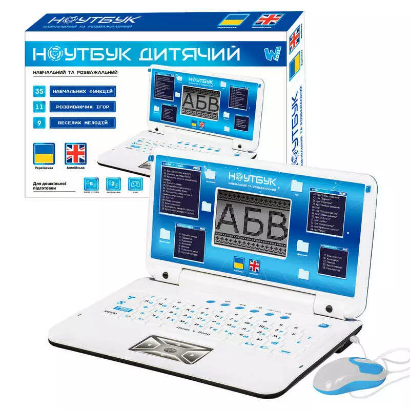 Главная > Каталог > Игрушки > Детские микрофоны > Ноутбук дитячий 50433 (12/2) ""WToys"", 35 навчальних функцій, 11 розвиваючих ігор, 9 мелодій, весь функціонал УКРАЇНСЬКОЮ та АНГЛ. МОВАМИ, 1 пісня російською, в коробці оптом
