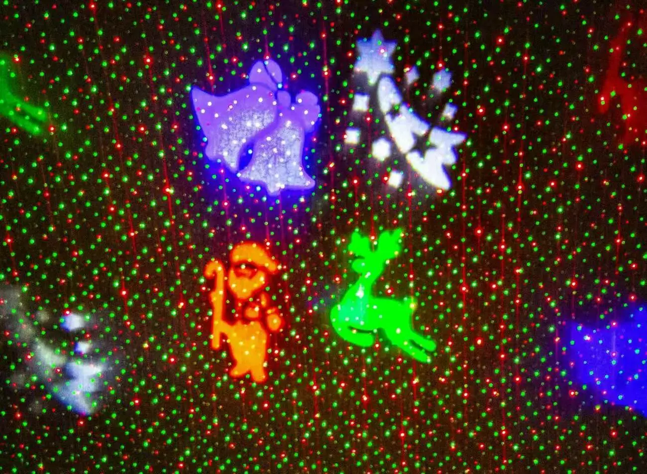 <p><strong>Описание:</strong></p><br /> <p>Очень качественный проектор с богатым набором функций. <br /><br /> Большим плюсом является наличие  металлического водонепроницаемого корпуса, и двухцветность на фоне которого движутся красивые большие разноцветные фигуры. Цвета; красный, синий, зелёный, белый, благодаря постоянно крутящемуся диску фигуры перемещаясь в автоматическом режиме по выбранному рельефу смещаются, и одна  находит на другую, в тот же миг с крайних точек появляются новые фигуры елочки которые стремятся на встречу друг к другу, снежинки и елочки хорошо прорисованы и реалистичны. Устройство можно закрепить на стене в помещении, так же благодаря специальной съёмной шпильке можно установить на улице в грунт для лазерного диско шоу либо освещения фасада дома в ночное время.. </p><br /> <p>Защита от осадков IP44-65; <br /><br /> Рабочая температура: от -20 до +30°C (если новогодний проектор находился в теплом помещении, дать адаптироваться 15 минут на морозе перед включением); <br /><br /> Расстояние эффективного свечения от 2 до 25м, на больших расстояниях уменьшается кучность и яркость (то есть растягивается); <br /><br /> Площадь покрытия 20-160 м2; </p><br /> <p> </p><br /> <p><strong>Характеристики:</strong></p><br /> <p>Заливочный лазер красно-зеленого-синий цвета.</p><br /> <p>Эффекты: более тысячи движущихся точек RG</p><br /> <p>Красный: 100mW 650nm</p><br /> <p>Зеленый: 30mW 532nm</p><br /> <p>Блок питания: 5V 1A</p><br /> <p>Максимальная мощность лазера: <1 мВт</p><br /> <p>Подходит для сада, парка, украшения новогодней елки, заливки здания и т.д</p><br /> <p>Рабочая температура: -40° ~+40°C</p><br /> <p>Водонепроницаемость: IP65</p><br /> <p>Адаптер: 100-240V, 50/60Hz</p><br /> <p>Материал: плаcтик</p><br /> <p>Провод: 3 метра</p><br /> <p>Размер коробки: 180*135*175 мм</p><br /> <p>Вес: 0,85 кг</p><br />
