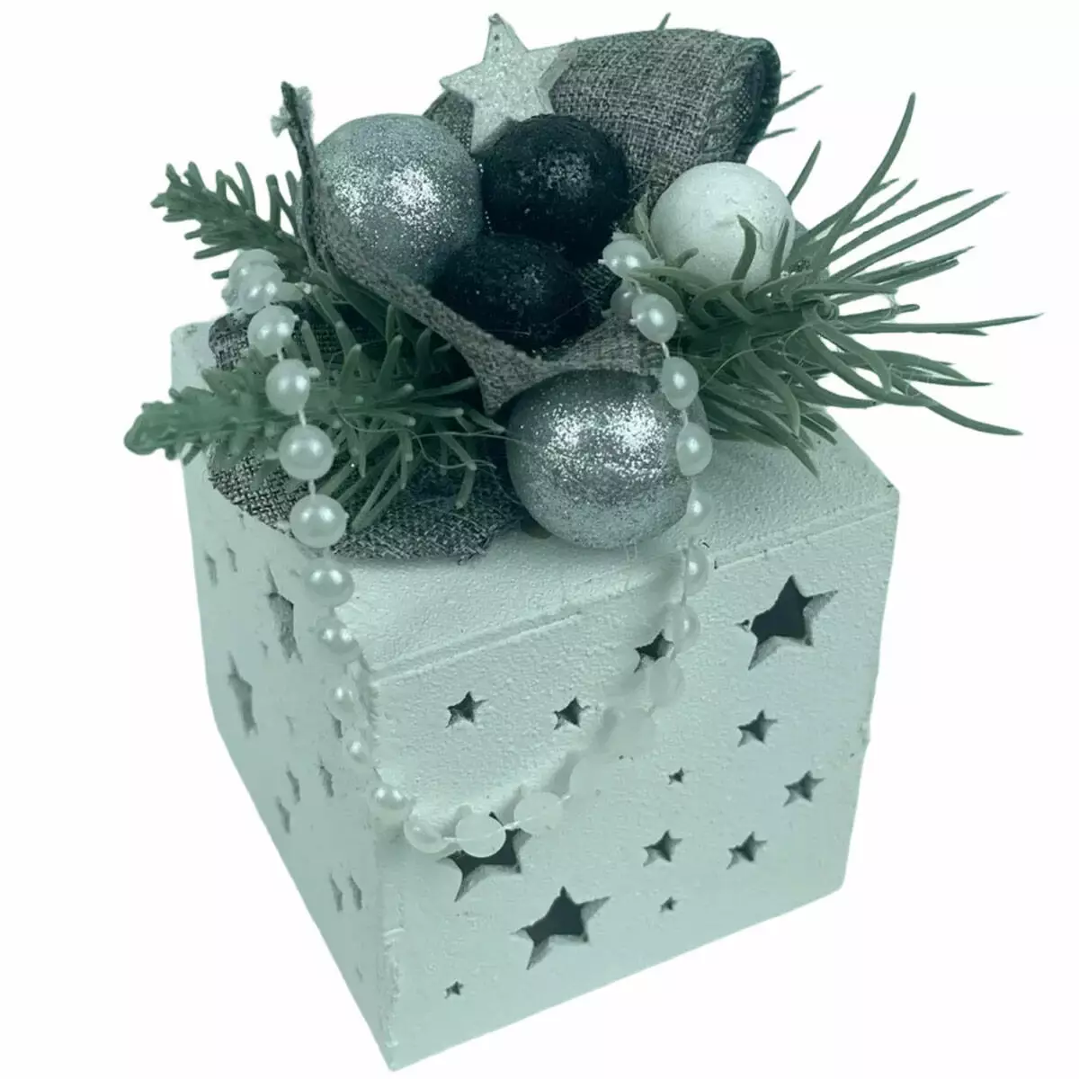 Оригінальна новорічна підвіска у формі подарункової коробки виготовлена з дерева та декорована об’ємними святковими елементами. Верх прикрашений штучною хвоєю, блискучими кулями, стрічкою з тканини та декоративним намистом, що робить композицію завершеною та святковою. Поверхня коробки оформлена прорізами у формі зірок, які створюють додатковий візуальний ефект.