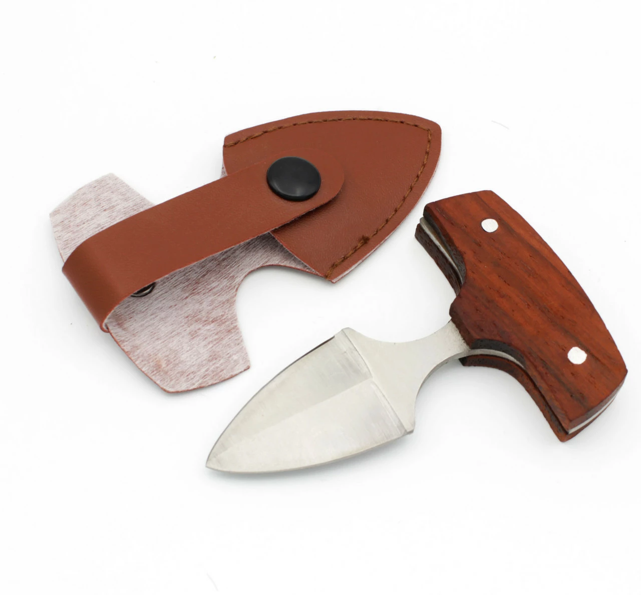 Нож тычковый в чехле. Ручка деревянная. Заточка ножа двухсторонняя. Размеры изделия 8.7 см и ширина ручки 6 см, ширина лезвия 2.8 см. Хорошая вещь для охотников.