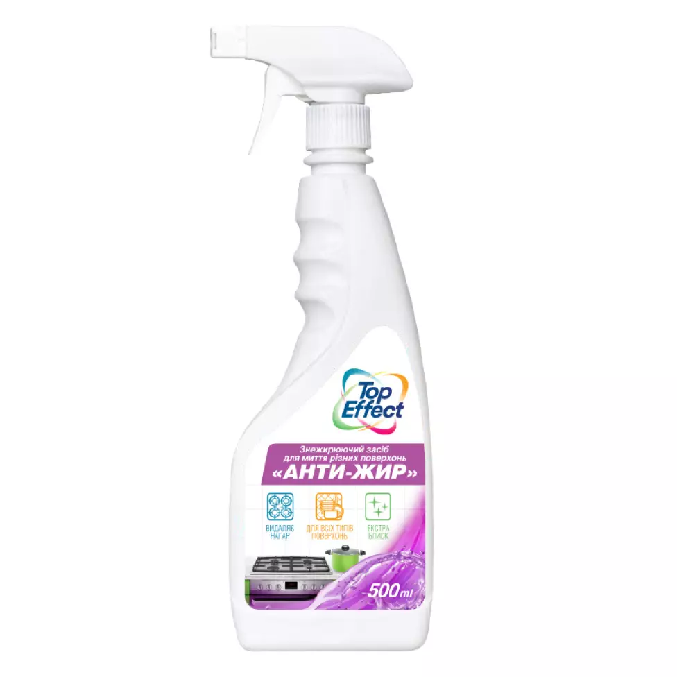 "TopEffect" "Анти-жир" - это обезжиривающее средство для мытья различных поверхностей в спрей-флаконе объемом 500 мл. , требующие обезжиривания