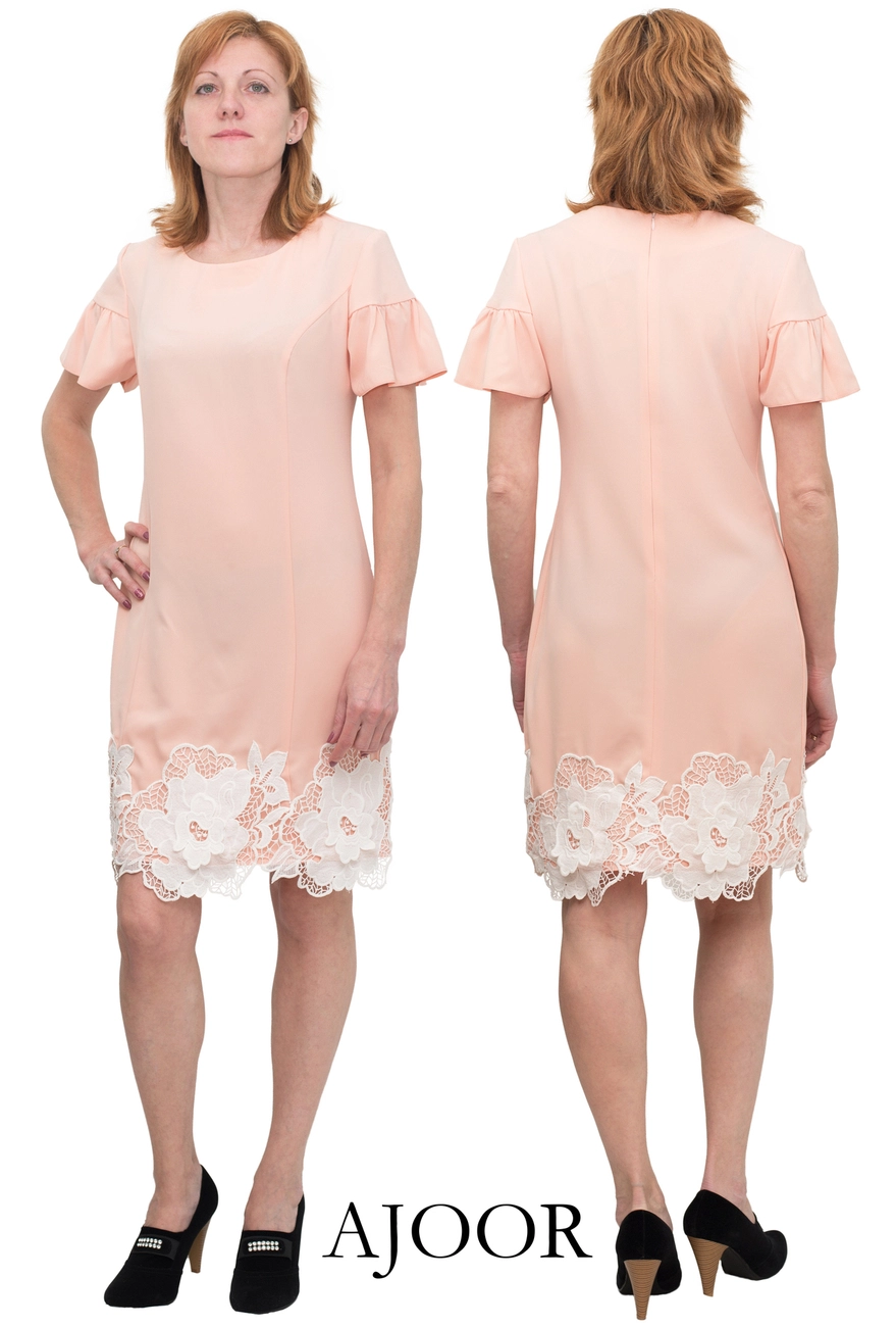 Очень симпатичное платье  выполнено из крепа  персикового,голубого или бирюзового цвета.Платье украшено широким кружевом 3-D формате,рукав закончен оборкой,по спинке потайная змейка,разм 42-44-46