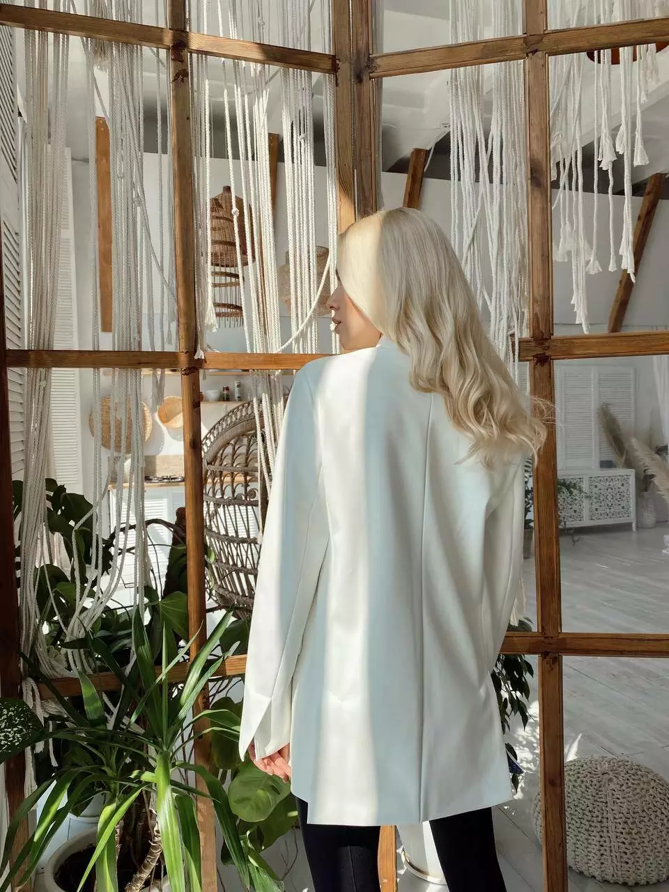Модель має прямий крій, стриманий, але дуже елегантний та стильний, має два шліци по спинці та два на рукавах, відкладний комір і застібається на ґудзик.