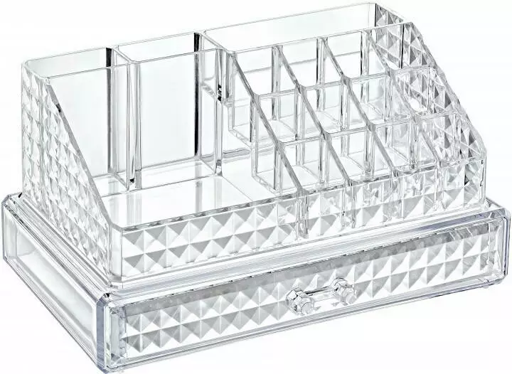 Органайзер виконаний із міцного та довговічного пластику. Він має лаконічний дизайн із вишуканим алмазним візерунком. Органайзер складається з двох основних відділень: верхньої відкритої та нижньої висувної скриньки.