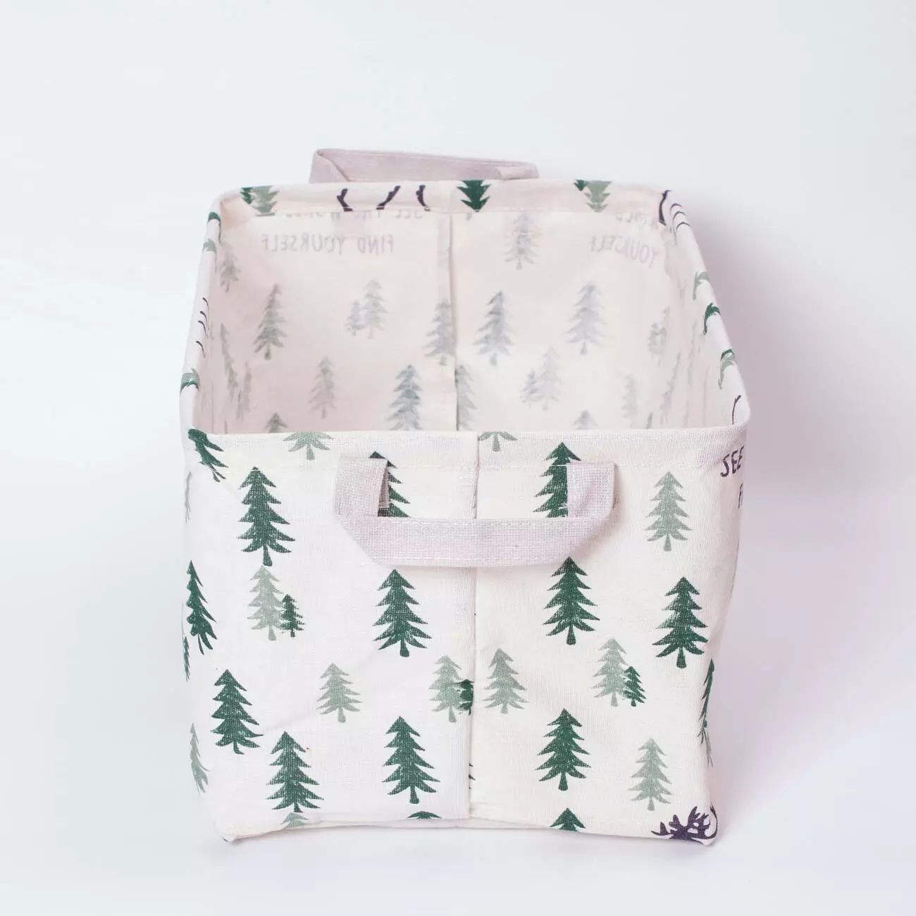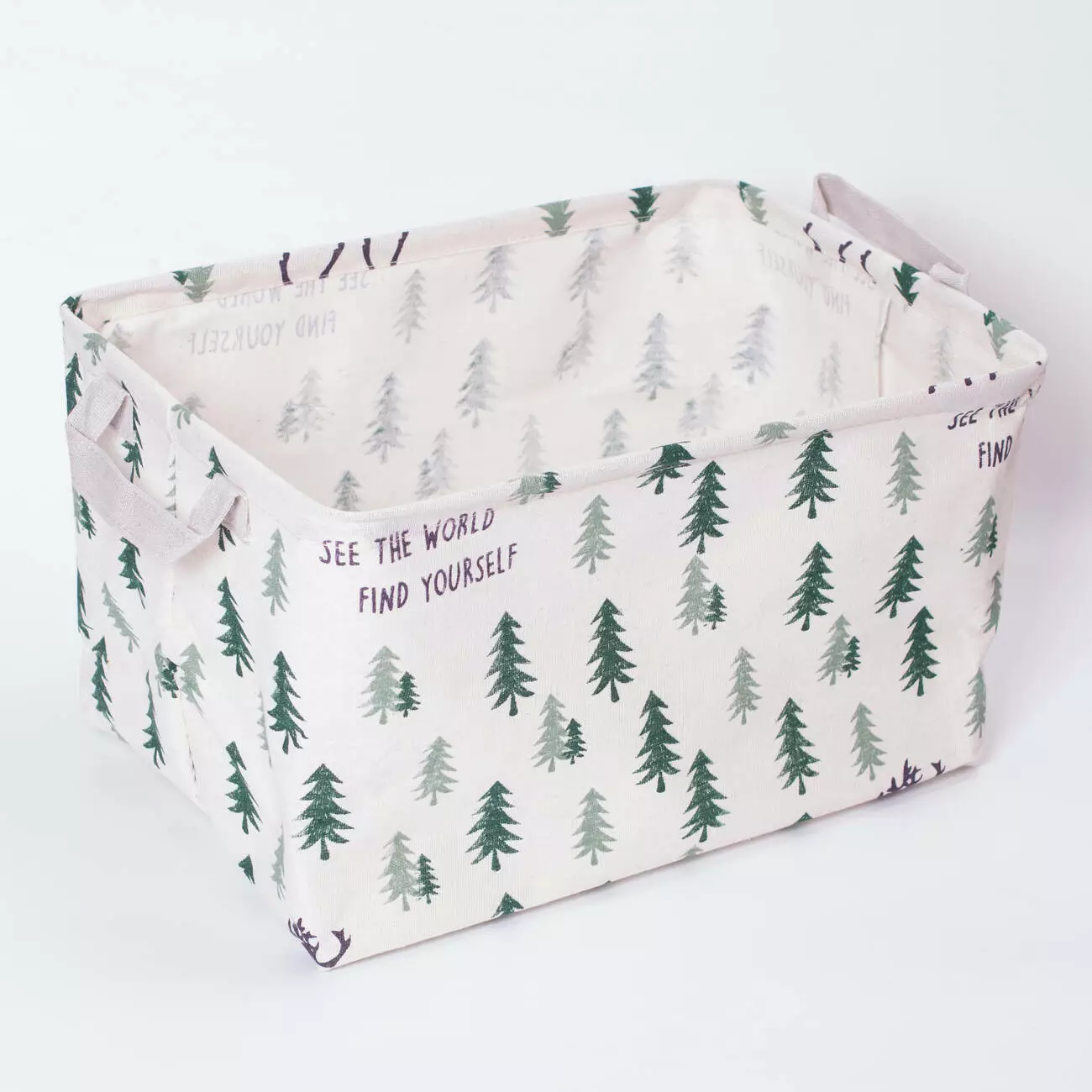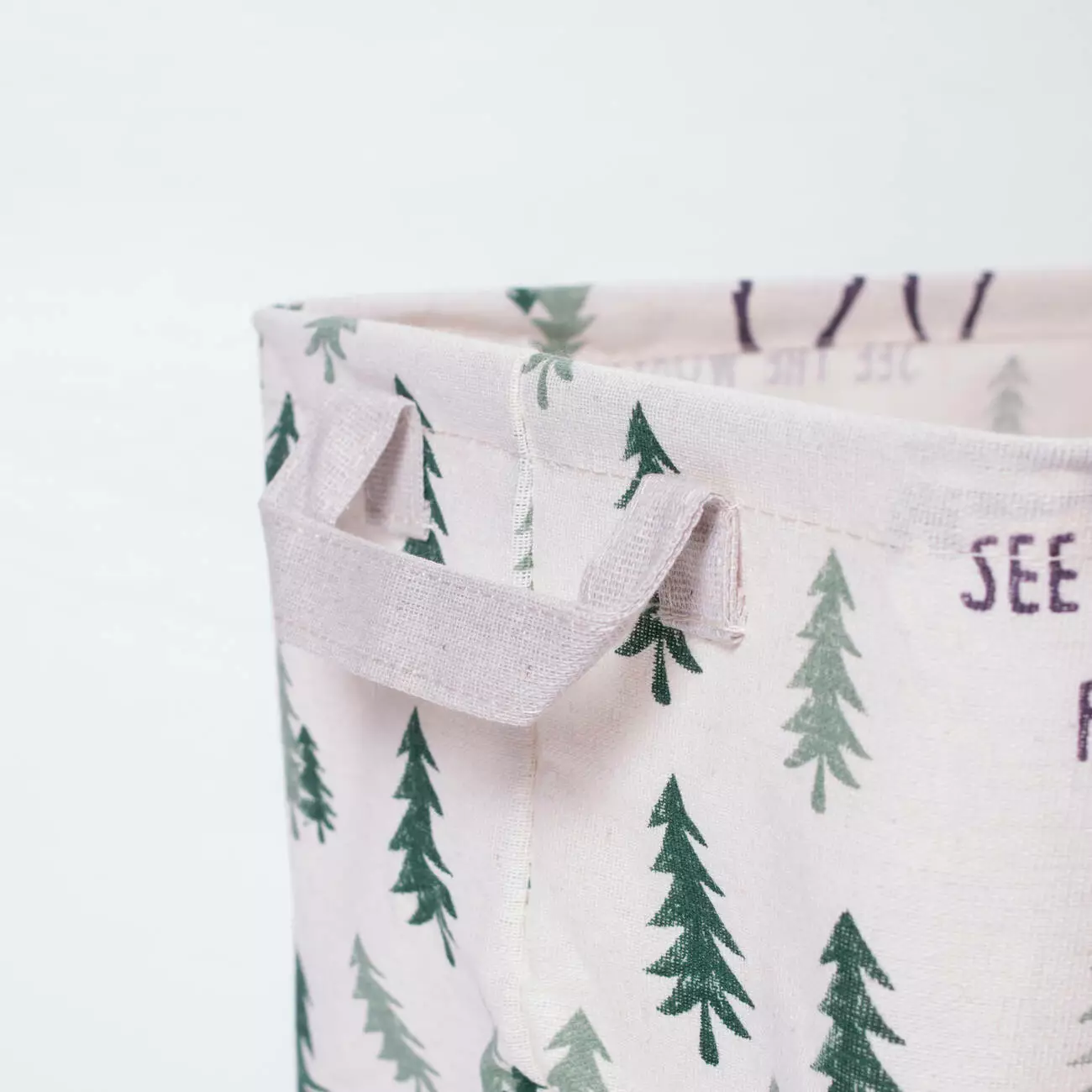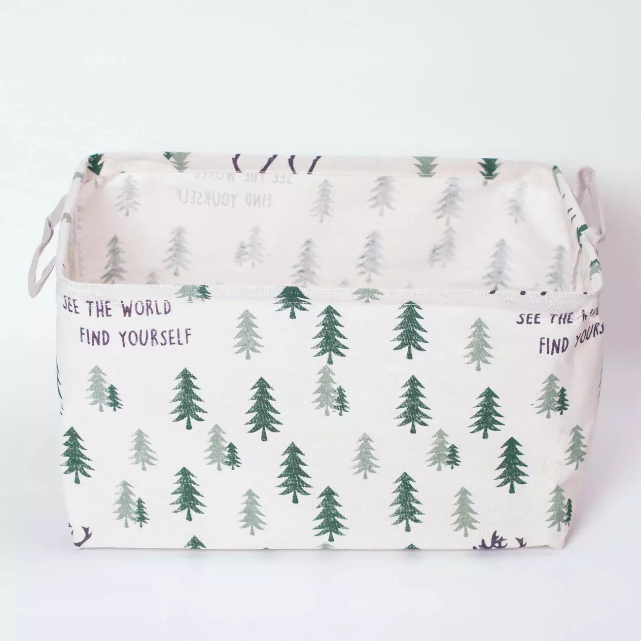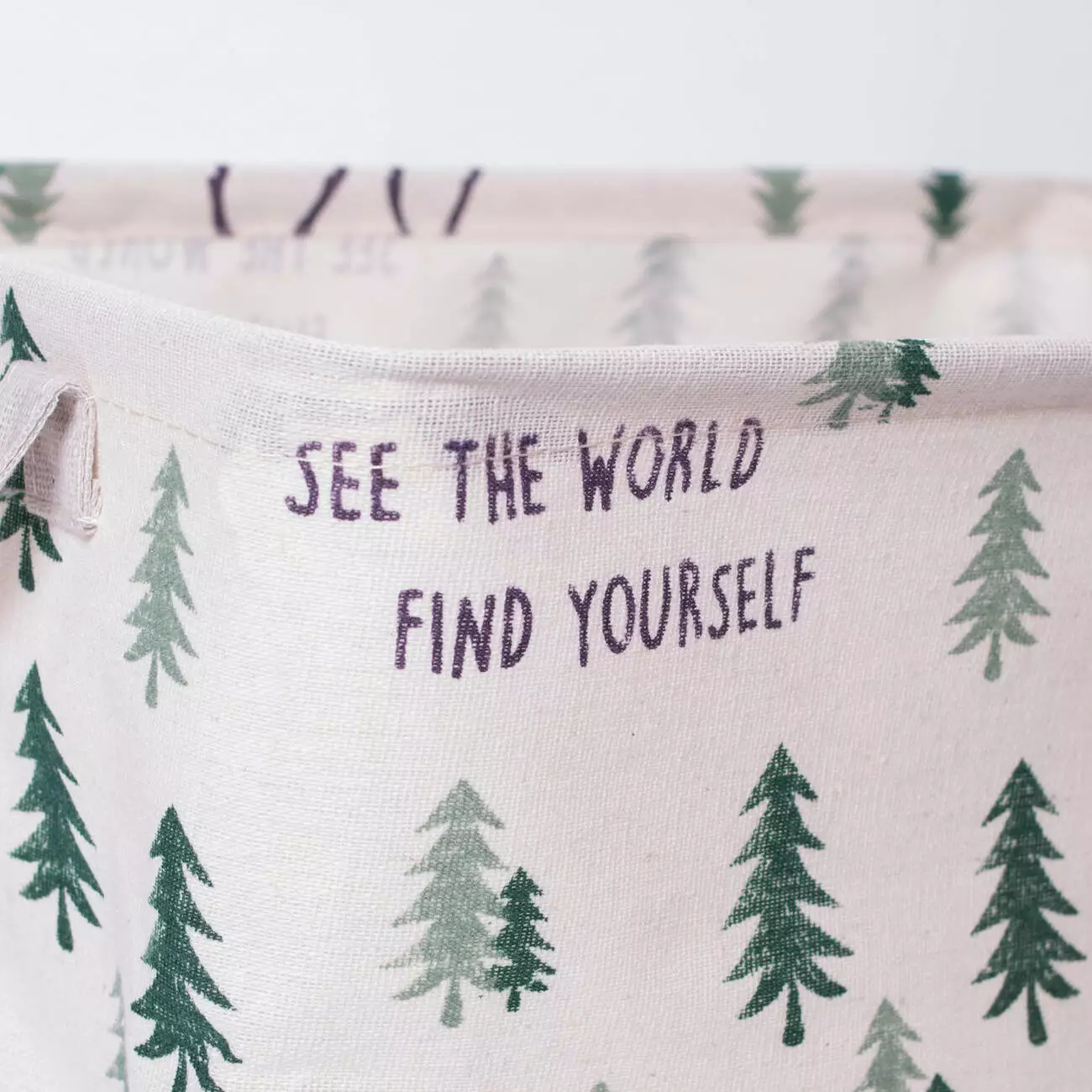 Виготовлений із текстильного матеріалу, органайзер поєднує легкість (вага 200 г) з міцністю. Стійка форма зберігається навіть при частому використанні, а ручки з боків забезпечують зручне перенесення. Дизайн із принтом хвойних дерев та написами "SEE THE WORLD" і "FIND YOURSELF" додає виробу декоративної функції — він гармонійно вписується в інтер’єр.