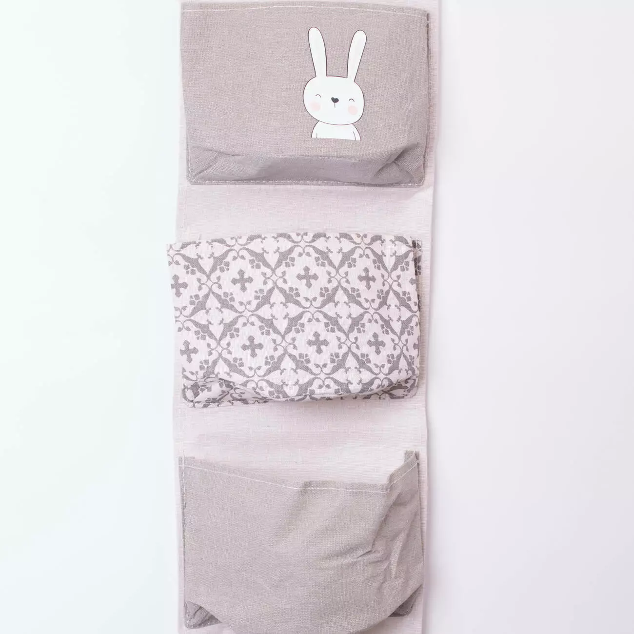 Конструкція складається з п’яти окремих кишень, розташованих вертикально. Кожна секція забезпечує окрему зону для зберігання, що дозволяє впорядкувати речі за категоріями. Органайзер виготовлений із текстильного матеріалу, а бамбукова ручка з мотузкою забезпечує легке та надійне кріплення.