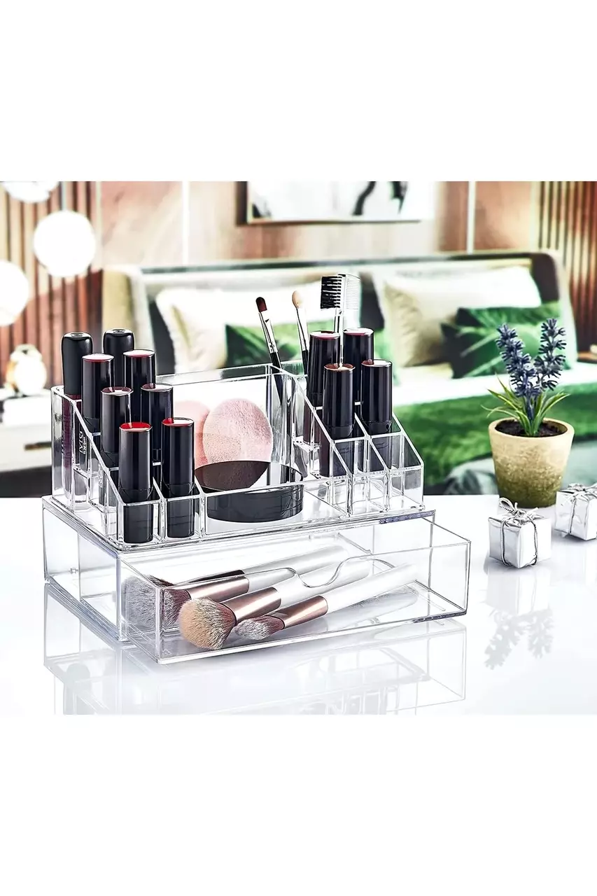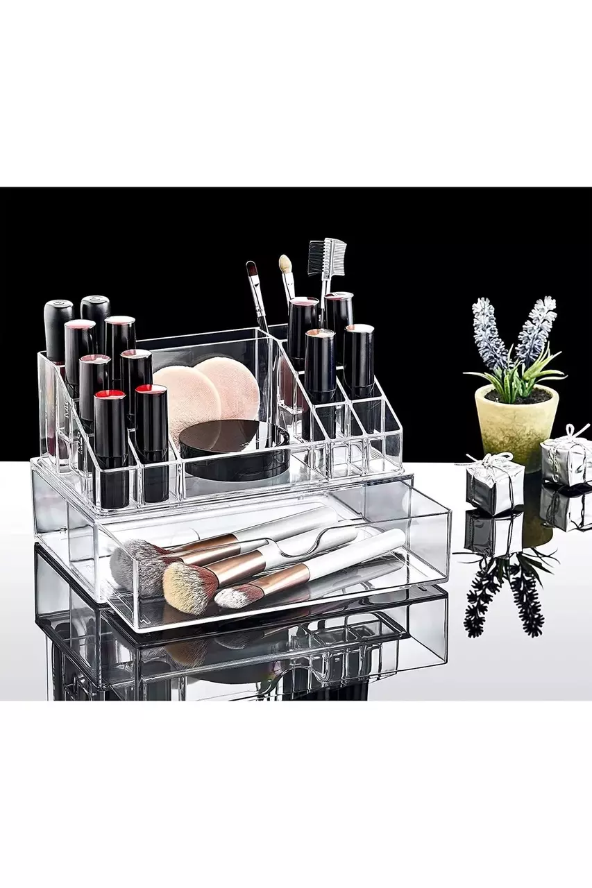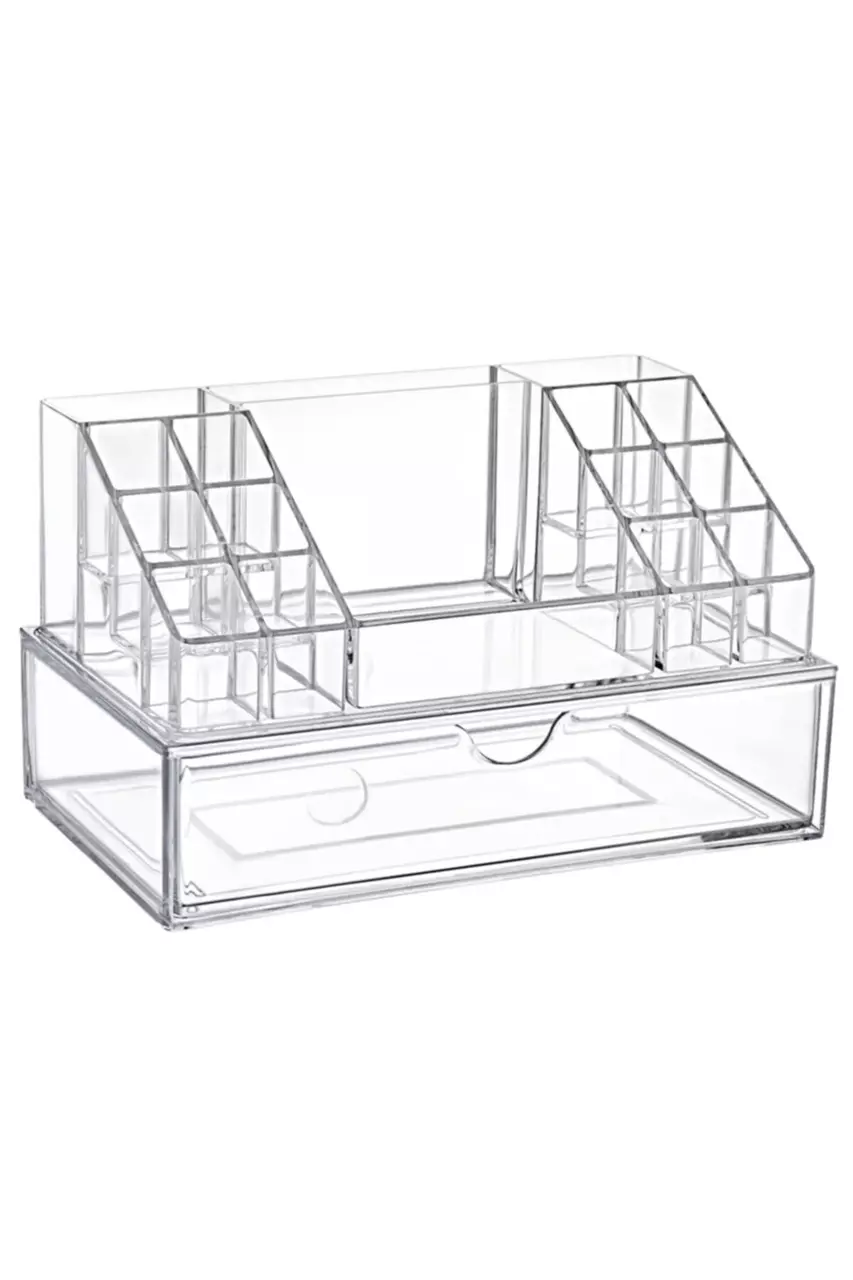Органайзер має зручну конструкцію, яка дозволяє розмістити все потрібне. Він складається з двох відділень: верхнє відділення – для зберігання косметики, нижнє відділення – для зберігання аксесуарів.