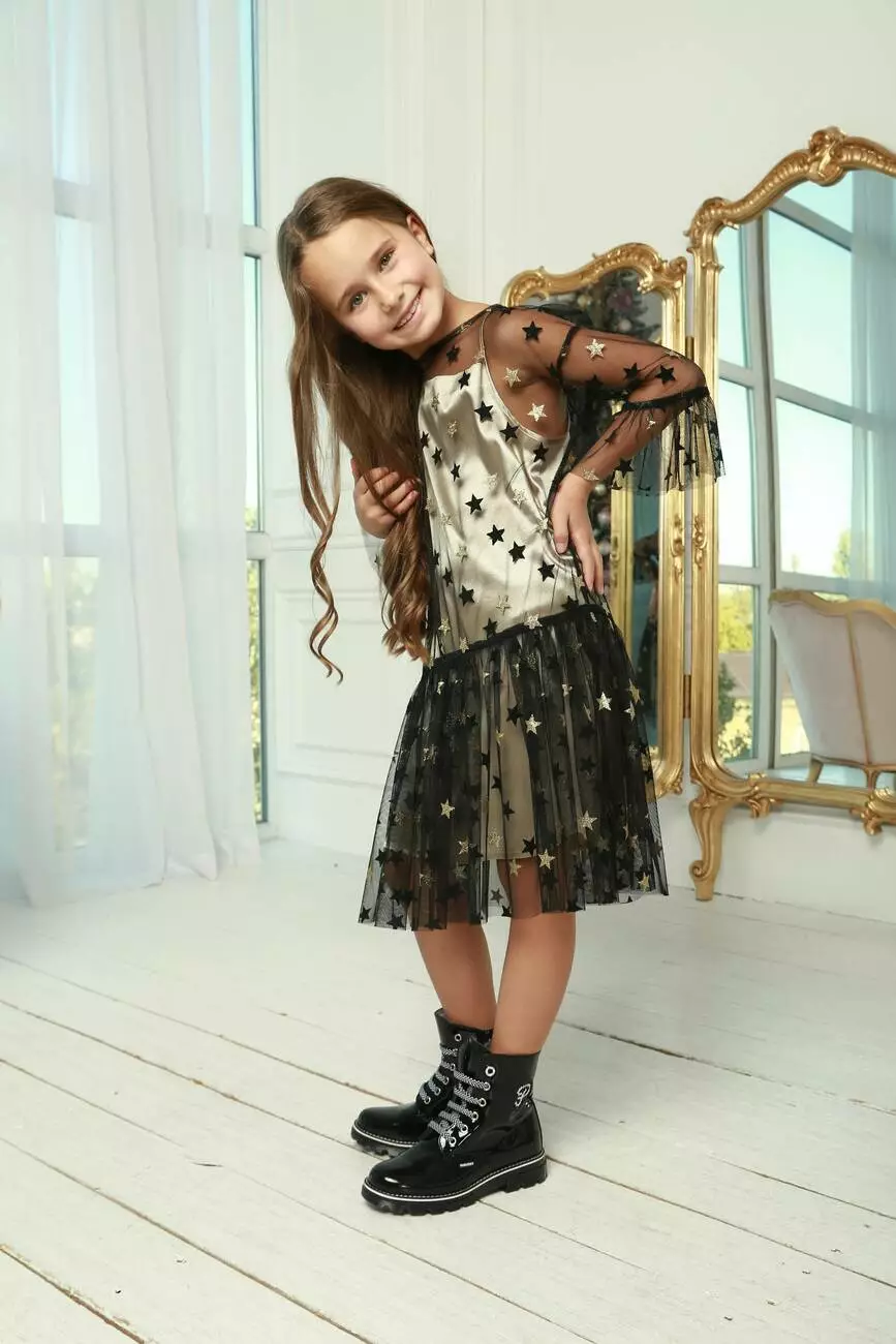 Деталі моделі: Плаття складається з двох частин. Нижня частина з атласу на тонких бретелях. Колір атласу - золото. Верхня частина - чорна накидка з фатину з рукавами 3/4. Декор - чорні і золоті зірки.