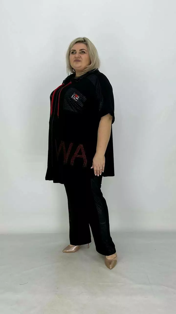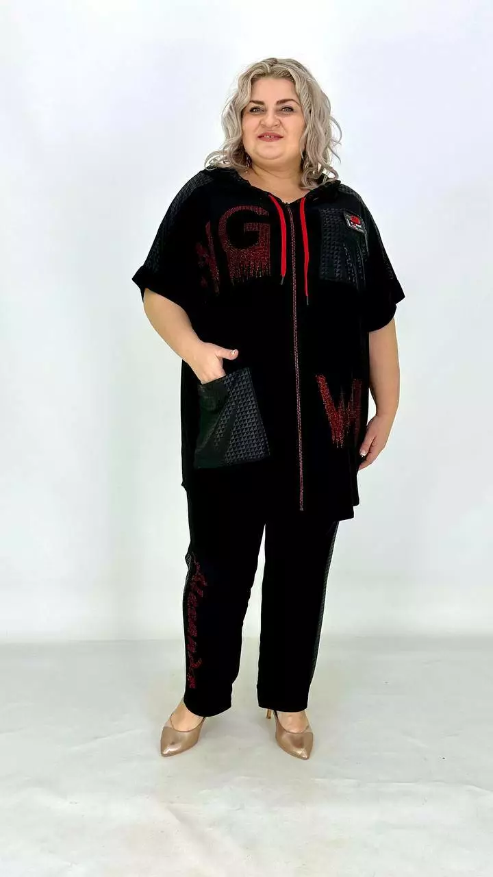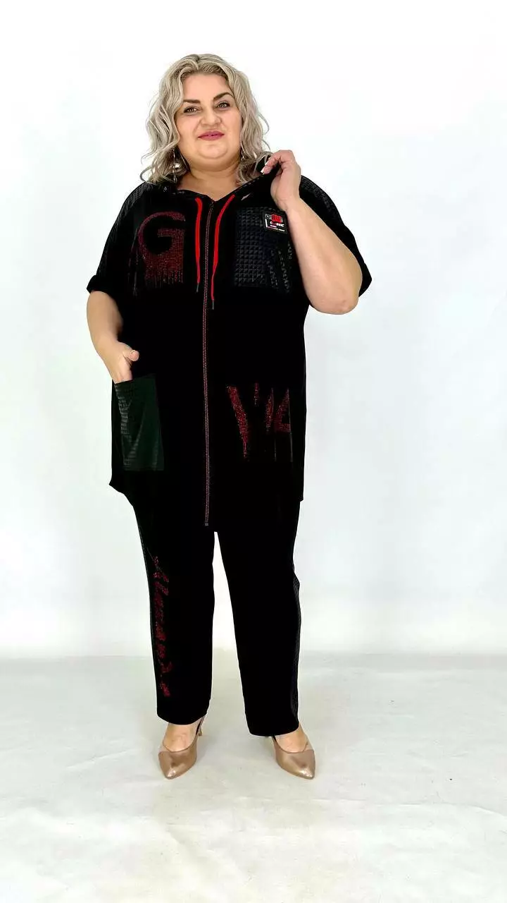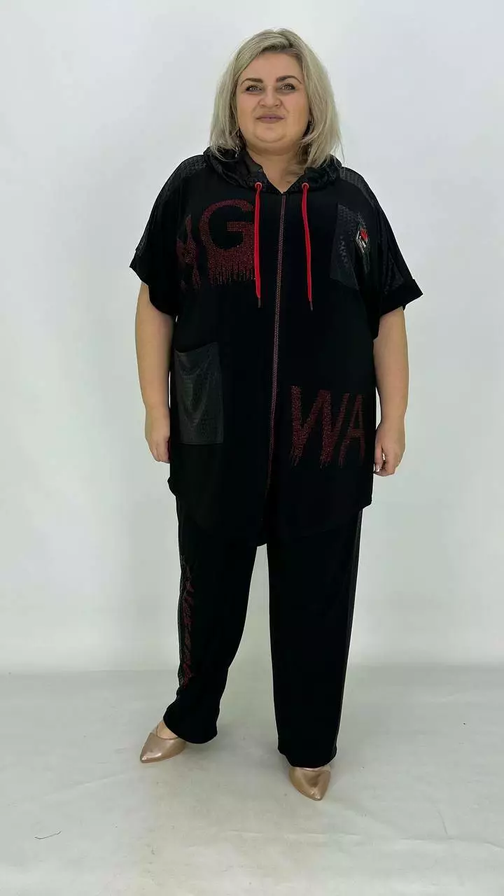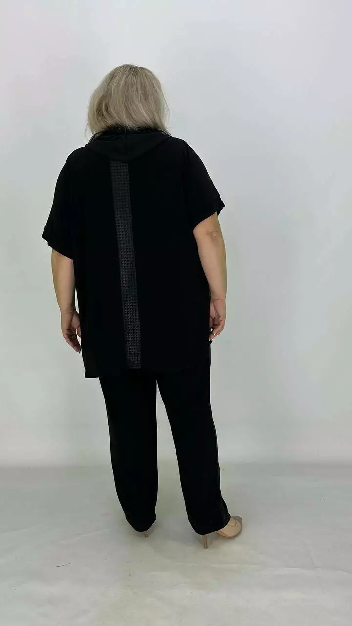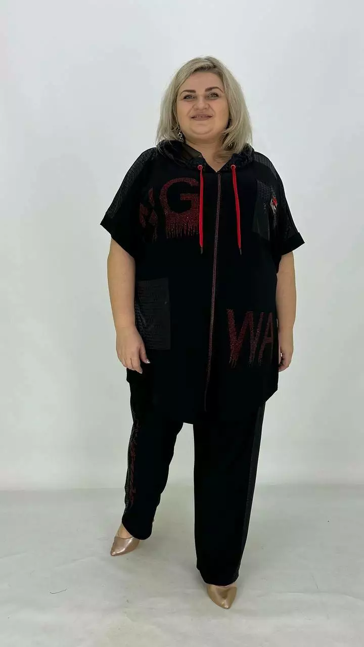 Костюм з тканини дуже якісна корейське масло. Оздоблення якісний дифлекс. Дорогий накат з каміння.Туніка з капюшоном із сітки, на змійці, має накладну кишеню. Штани вільного крою, на резинці. Тканина високої якості, легка у догляді.