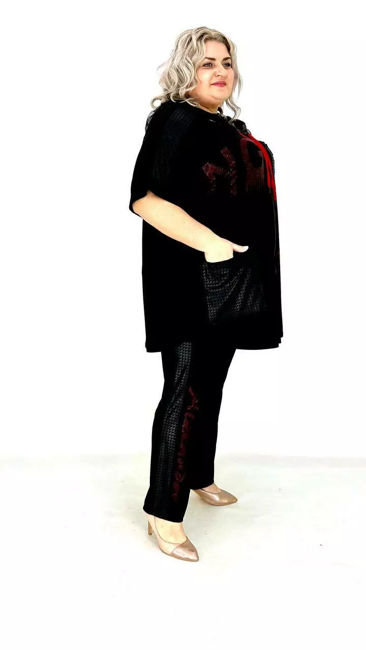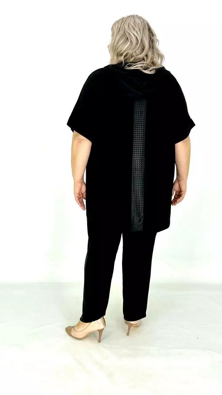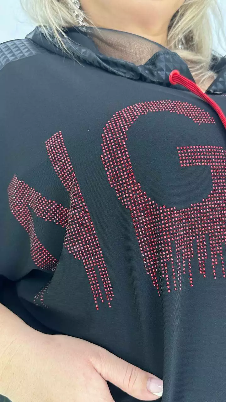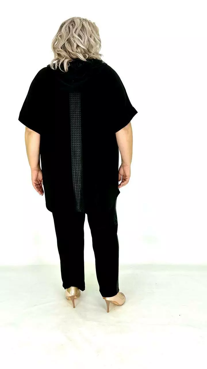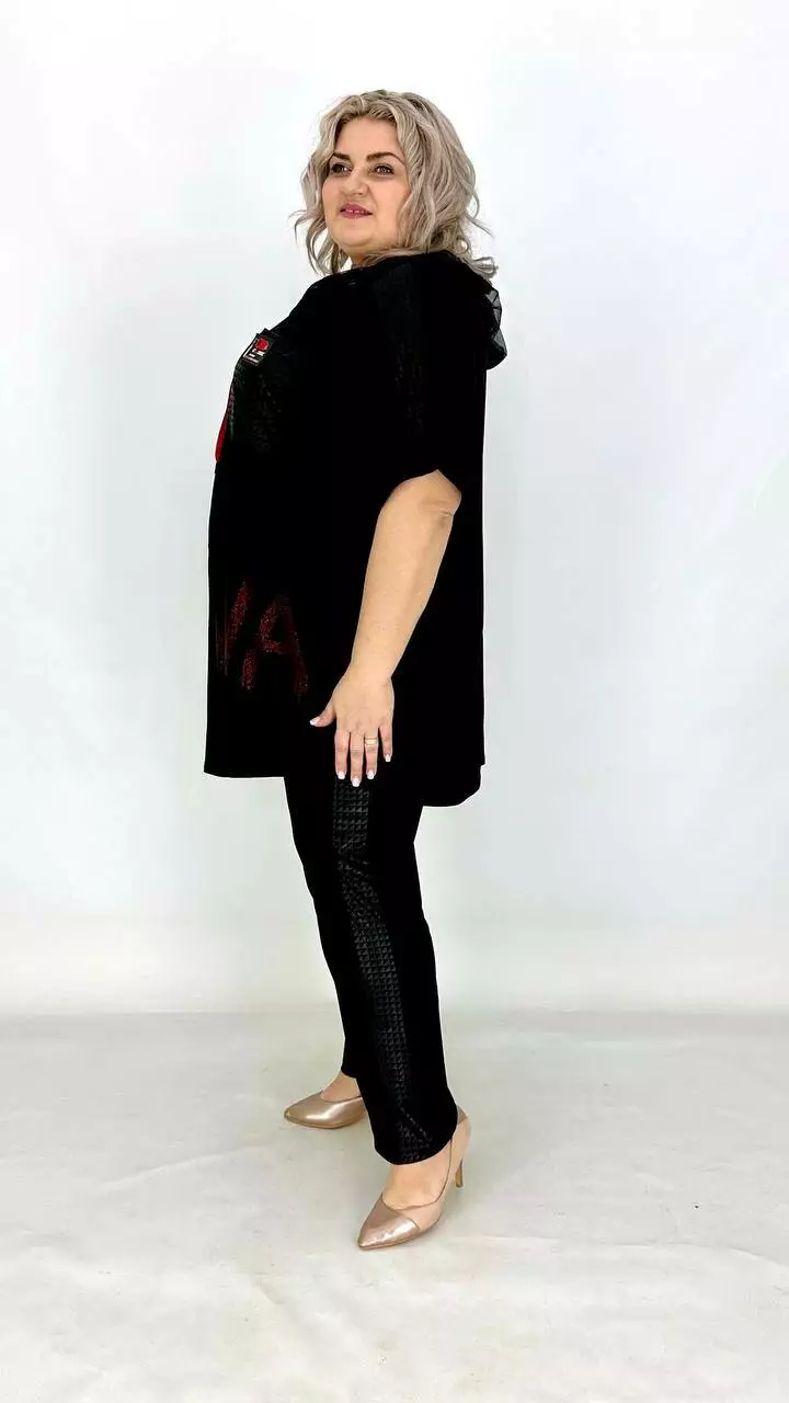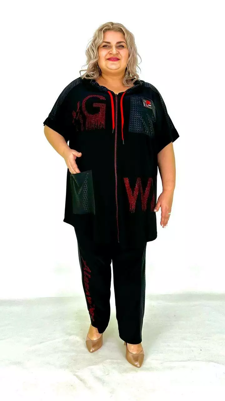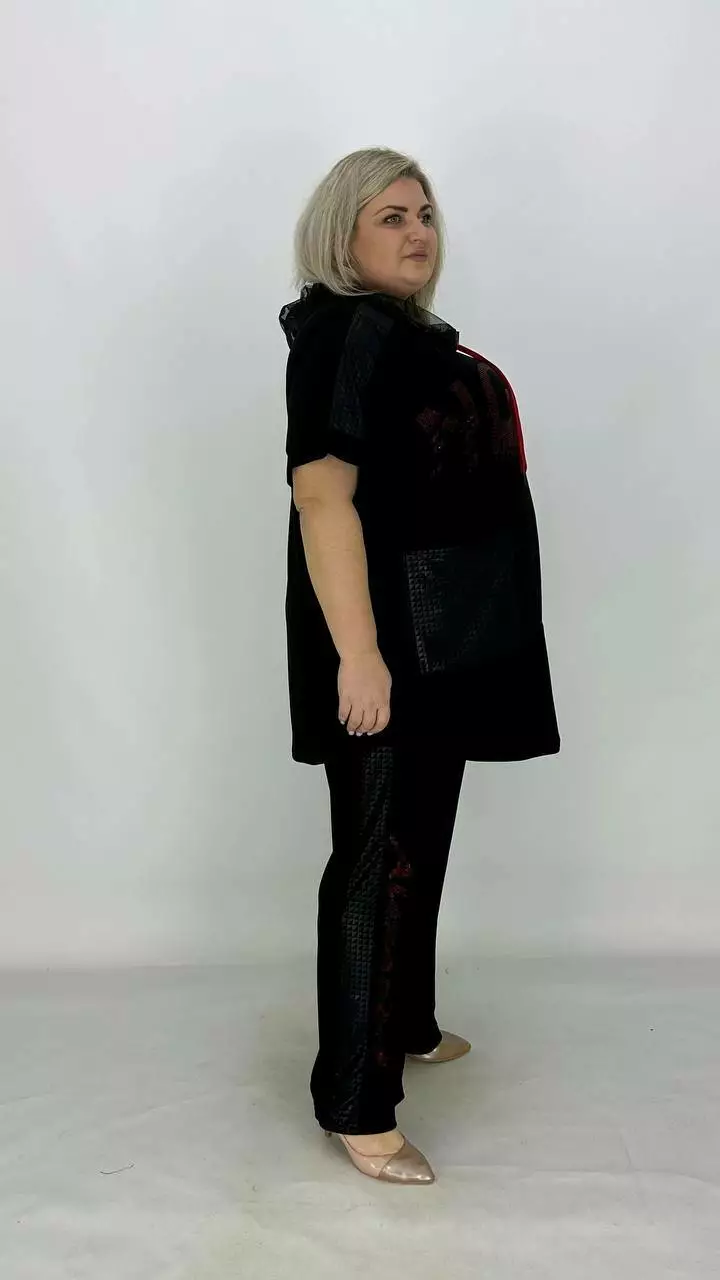 Костюм з тканини дуже якісна корейське масло. Оздоблення якісний дифлекс. Дорогий накат з каміння.Туніка з капюшоном із сітки, на змійці, має накладну кишеню. Штани вільного крою, на резинці. Тканина високої якості, легка у догляді.